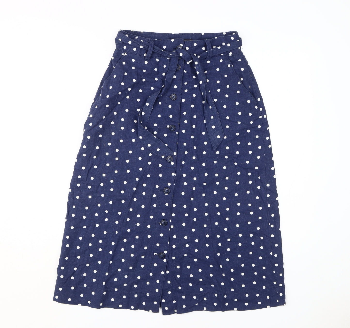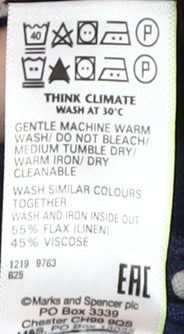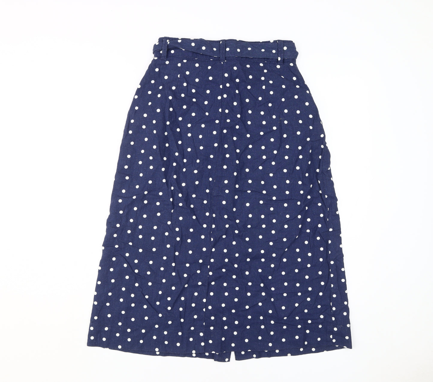 Discover a perfect blend of classic style and modern comfort with this Marks and Spencer Women's Blue Polka Dot Midi Skirt. Crafted from a high-quality fabric mix of 55% Linen and 45% Viscose, this skirt offers both durability and breathability, making it an ideal choice for summer outings and casual wear. The striking blue hue, adorned with a charming polka dot pattern, adds a playful yet elegant touch to any wardrobe. Designed in a flattering A-line silhouette, this skirt boasts a trendy midi length, perfect for any casual occasion. The mid-rise waist and button closure ensure a comfortable and secure fit, while the practical pockets add a functional element to its design. Whether paired with a simple tee or a chic blouse, this versatile skirt effortlessly elevates your everyday look. With its excellent condition and no visible defects, you can be assured of both quality and style. Indulge in the timeless appeal of this Marks and Spencer piece and make it a staple in your wardrobe. At a competitive price, this skirt represents both value and fashion-forward elegance.