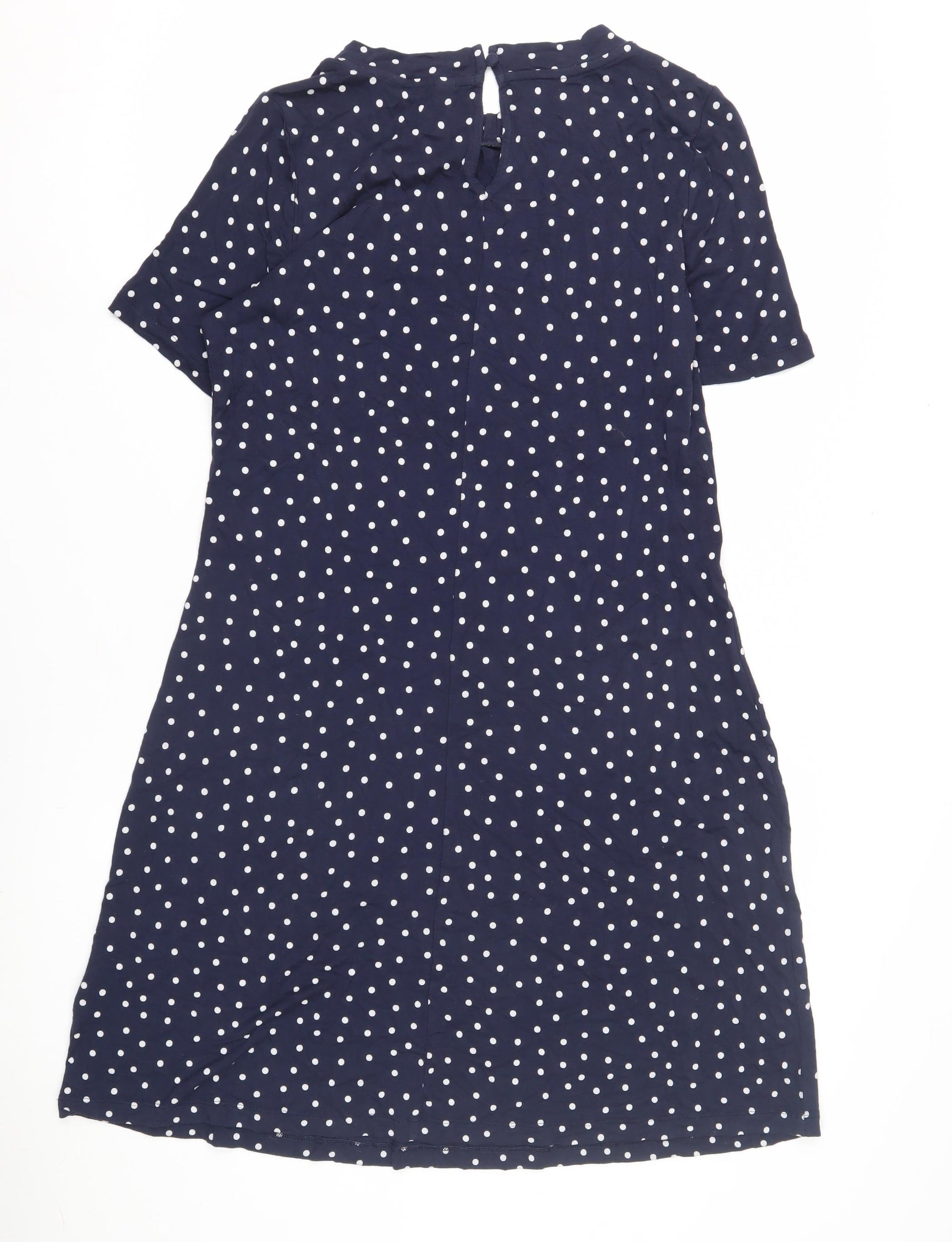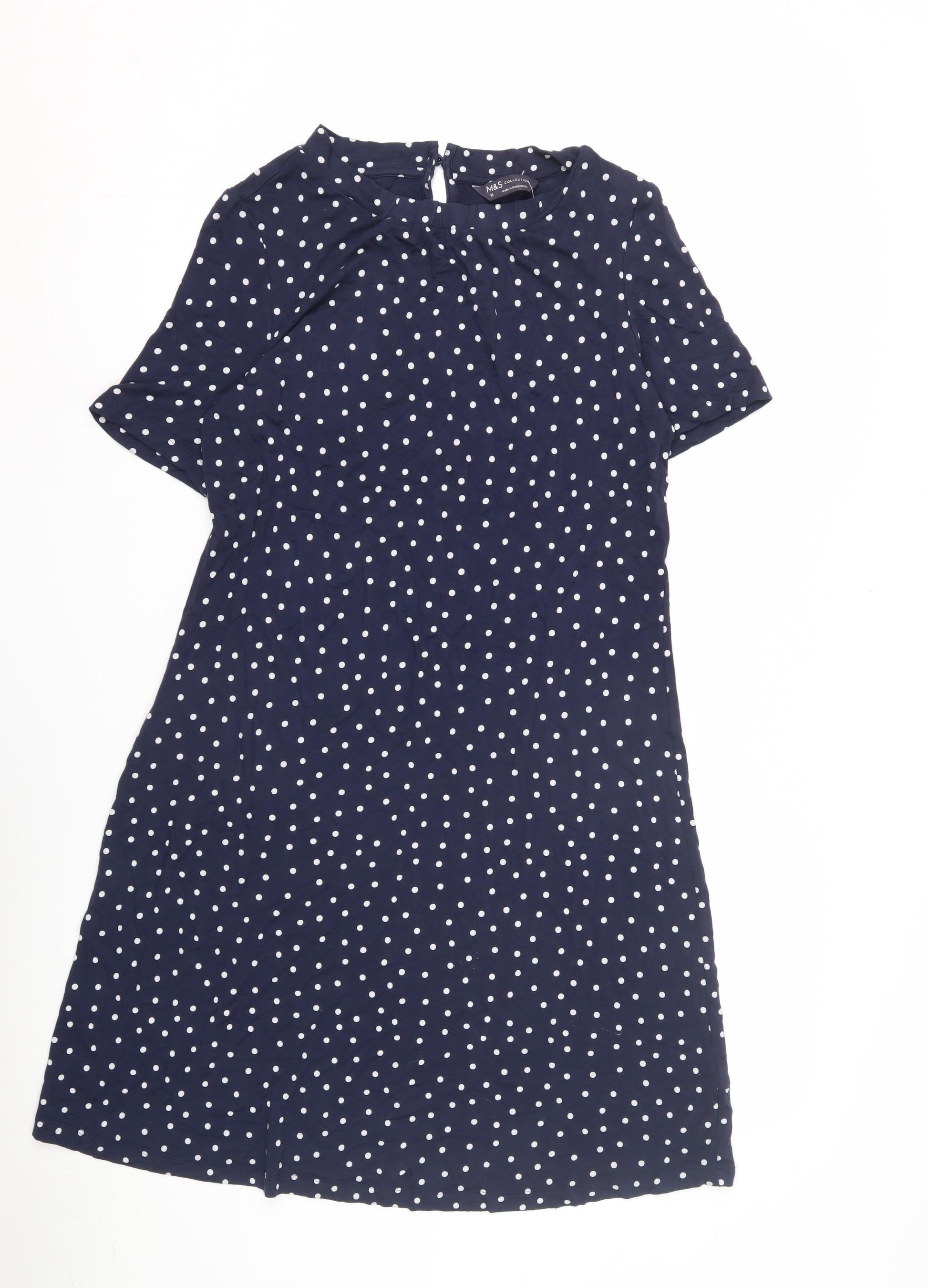 Step out in style with this classic Marks and Spencer polka dot shift dress, perfect for your casual spring and summer outings. Designed for comfort and effortless elegance, this knee-length dress in a striking blue hue is sure to become a staple in your wardrobe. The dress features a timeless shift style, paired with a crew neckline and half sleeves, delivering both charm and ease. Made from high-quality jersey fabric, it consists of 95% polyester and 5% elastane, ensuring a lightweight and comfortable wear. Its machine-washable nature enhances its practicality, making it easy to maintain. With a regular fit, this dress is perfect for everyday wear, suitable to pair with various accessories to suit different occasions. The enchanting polka dot pattern adds a playful yet sophisticated touch. Whether you're heading out for a casual day with friends or just enjoying a leisurely walk, this dress enriches your style with minimal effort. Don't miss out on the chance to own this exceptional piece to elevate your fashion sense effortlessly.