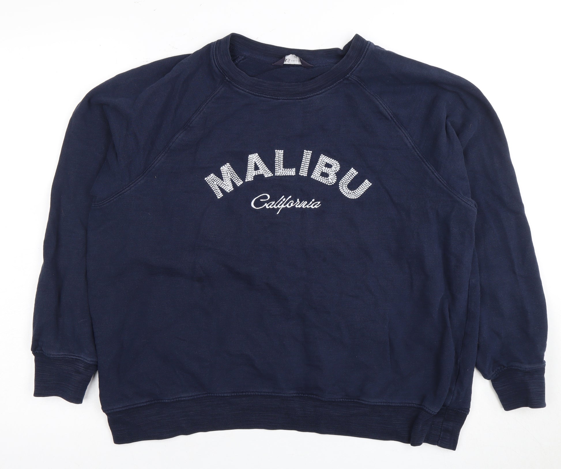 Discover the relaxed charm and classic appeal of this Marks and Spencer Women's Blue Pullover Sweatshirt, designed to offer comfort and style. With its deep navy hue, this sweatshirt effortlessly pairs with any wardrobe staple, making it a versatile addition to your collection. Crafted from 100% Cotton Jersey, it promises a soft, breathable touch perfect for autumn and winter vibes. The embroidered 'Malibu California' theme across the chest adds a touch of city-inspired flair, making it not just a piece, but a statement. Ideal for women seeking casual yet chic, this raglan-sleeve sweatshirt with a crew neckline assures a regular fit that's flattering and easy-going. Easy to care for, just toss it in the washing machine and wear it time and again. Slight wear may be noted from previous use, which merely adds character without taking away from its integrity. Priced competitively, this piece could be your go-to choice for that perfect blend of fashion and comfort. Don't miss out on this wardrobe staple, ideal for those who appreciate the simplicity and elegance of a well-made sweatshirt.