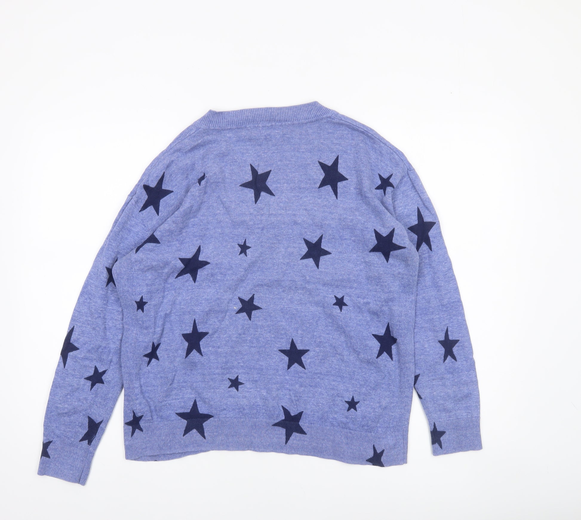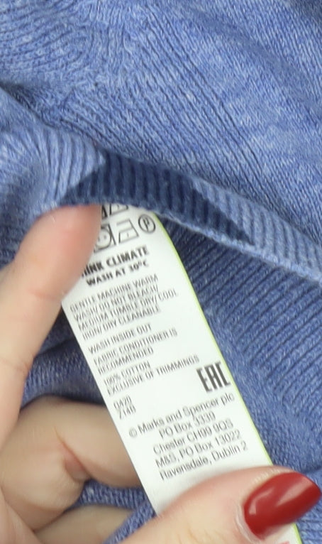 Add a playful twist to your knitwear collection with this stylish Marks and Spencer Women’s Blue Star V-Neck Jumper. Crafted from a soft and breathable cotton blend, this lightweight pullover ensures warmth and comfort throughout the cooler months while offering versatility for transitional weather. The bold navy star pattern brings a cheerful touch to the lovely heather blue base, creating a standout yet wearable casual piece that effortlessly elevates any wardrobe.Designed with a flattering V-neckline, this jumper offers a relaxed fit that’s both comfortable and easy to layer over shirts or under coats. The long sleeves and ribbed cuffs add a touch of structure while maintaining a cosy feel. Knitted from a mix of cotton and polyester, its soft texture and durable quality make it ideal for everyday wear, while the breathable fabric keeps you feeling comfortable during long days out or relaxing at home.Perfect for adding a dash of personality to jeans, skirts or tailored trousers, this jumper combines casual elegance with fun detailing. Its all-season suitability makes it a practical favourite for spring through winter, while the relaxed silhouette ensures a flattering drape for a range of body shapes. Whether worn for a laid-back day at work, weekend outings, or effortless home comfort, this jumper delivers both softness and style.Marks and Spencer’s attention to detail guarantees enduring quality, and the subtle luxury of this piece reflects the brand’s commitment to modern, wearable fashion. With machine washable practicality, it’s easy to care for and maintain. Presenting in excellent pre-loved condition, this jumper has minimal signs of wear and retains a fresh, well-kept appearance.Understated yet eye-catching with its star motif, this piece is perfect for those looking for a charming, easy-to-style staple. A must-have for women who love comfort, quality, and a splash of personality in their knitwear, this Marks and Spencer V-Neck Knit Jumper will light up any casual look with timeless charm and relaxed sophistication.