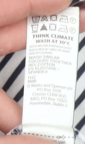 Add a timeless essential to your wardrobe with this women's blue striped 3/4 sleeve cotton T-shirt from Marks and Spencer. Crafted from a soft and breathable cotton with a hint of elastane for a comfortable, flexible fit, this striped jersey is perfect for effortless everyday style. The boat neckline and fitted 3/4 sleeves give it a flattering, classic silhouette that transitions easily from weekday layering to relaxed weekend wear. The blue and white stripe pattern delivers a nautical-inspired look that never goes out of style, ideal for pairing with jeans, chinos or skirts through spring, summer and autumn seasons. Designed in a soft jersey fabric, it’s both breathable and machine washable for easy care, making it a practical and stylish choice for any wardrobe. The pullover design ensures an easy fit, while the stretch material provides comfort and lasting shape retention. This Marks and Spencer top offers a reliable wardrobe staple for casual days, relaxed outings or layering under a blazer for understated elegance. Its timeless striped pattern and 3/4 sleeve cut make it a versatile choice for creating chic, simple looks all year round. In excellent pre-owned condition with light wear and no visible flaws, this top offers the quality and style synonymous with Marks and Spencer at an excellent value. A classic piece that remains endlessly wearable, combining comfort, simplicity, and classic British fashion design.