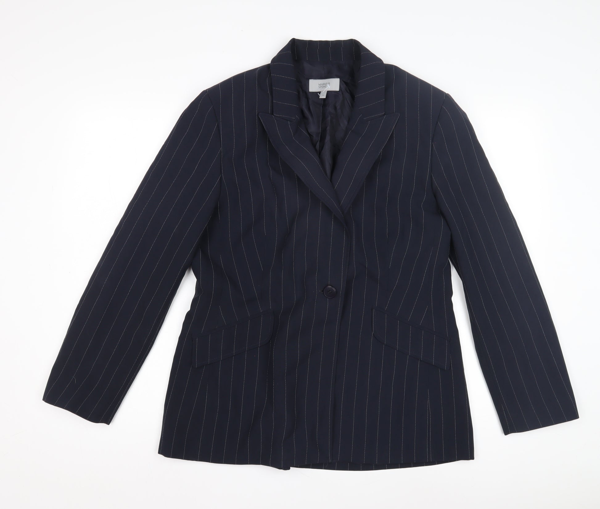 Elevate your professional wardrobe with this elegant Marks and Spencer Women's Blue Striped Blazer. Tailored in a classic, regular fit, this mid-length blazer ensures a polished appearance, ideal for business occasions or formal settings. Crafted from durable polyester, it offers a sophisticated striped pattern that adds a touch of style to your ensemble. Designed for comfort, the blazer includes a full lining made from polyester, providing a smooth feel against your skin. The long sleeves and button accents bring a timeless appeal, perfect for chic layering over your favourite outfits. Whether you're preparing for a pivotal meeting or aiming to enhance your work attire, this versatile blazer makes a compelling addition to any collection. Machine washable for easy care, it's suitable for autumnal seasons, offering style and convenience for busy schedules. Pair this essential piece with tailored trousers or a pencil skirt for an effortlessly iconic look.