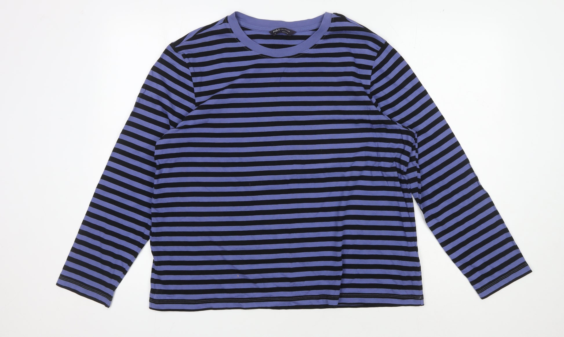 Elevate your casual wardrobe with this classic Marks and Spencer Women's Blue Striped Long Sleeve Top. Expertly crafted from 100% cotton, this T-shirt offers unparalleled comfort and breathability, making it an essential piece for all seasons. Its timeless crew neck and regular fit ensure a flattering silhouette for any body type, while the iconic striped pattern in blue adds a touch of style and sophistication.Perfect for everyday wear, whether you're heading to a casual day out or lounging at home, this long sleeve top offers versatile styling options. Pair it with your favourite jeans or layer it under a jacket for a chic, laid-back look. The pullover closure makes it easy to wear, while the machine washable care instructions ensure simple, hassle-free maintenance.This top is in excellent condition with no visible defects, offering you great value with the assurance of Marks and Spencer's quality and style. Don't miss the opportunity to add this staple piece to your collection.