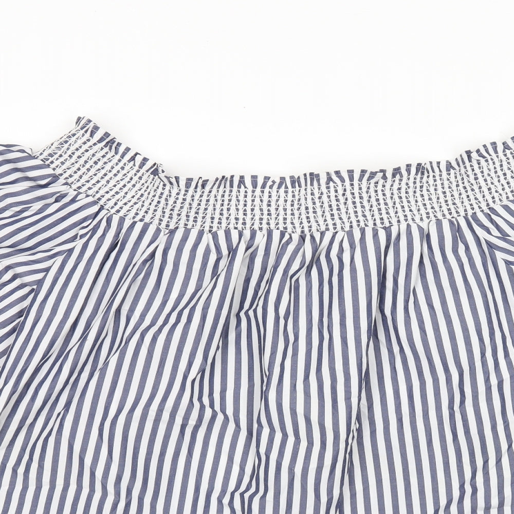 Womens Blue Striped Polyester Basic Blouse Size 12 Off the Shoulder - Leaf Embroidery