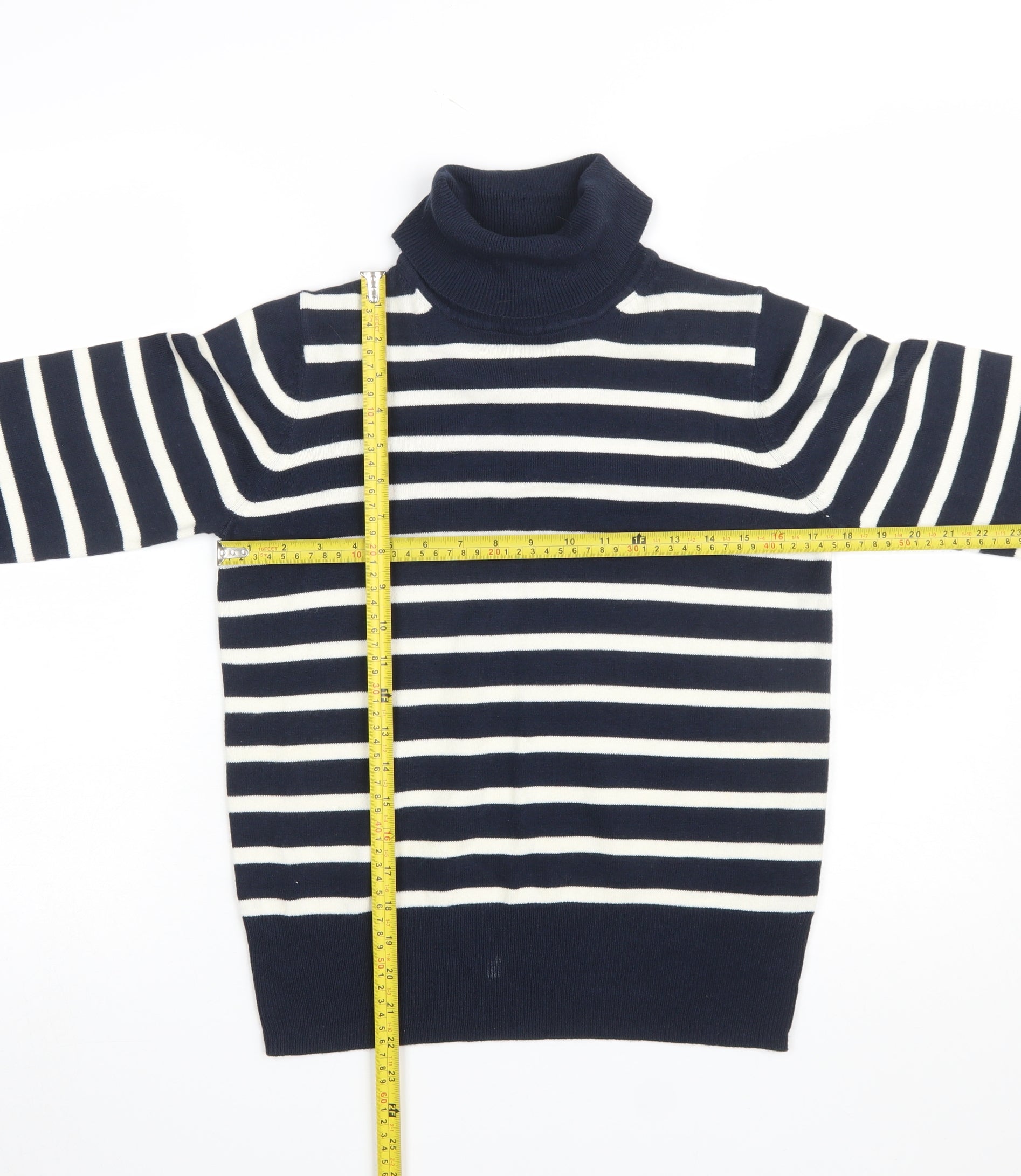 Stay stylish and cosy with this elegant Marks and Spencer women's roll neck jumper. Crafted from soft 100% acrylic knit, this jumper offers warmth and lightweight comfort, making it ideal for layering through autumn and winter. The classic navy blue base is beautifully offset by crisp white stripes, giving it a timeless nautical look that pairs effortlessly with jeans, skirts, or tailored trousers. Designed with a roll neck for both comfort and polish, this piece is perfect for smart-casual days, office wear, or relaxed weekends. The long sleeves and ribbed cuffs provide a snug fit, while the tight-knit fabric ensures shape retention and durability. The jumper has been gently worn and remains in very good condition, showing a small mark near the hem that does not detract from its overall style and wearability. Easy to care for, it is machine washable and retains its softness and structure after laundering. With its regular fit, this versatile staple complements all body shapes and is a wardrobe must-have for women seeking refined comfort with minimalist sophistication. Marks and Spencer’s quality craftsmanship ensures years of wear and timeless appeal. Perfect for everyday layering or pairing under a smart coat during the cooler seasons, this jumper combines functionality and chic design. Add this striped roll neck to your collection for an effortlessly put-together look that transitions smoothly from work to weekend with ease and style.