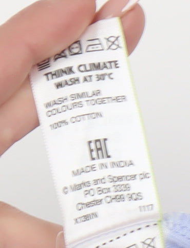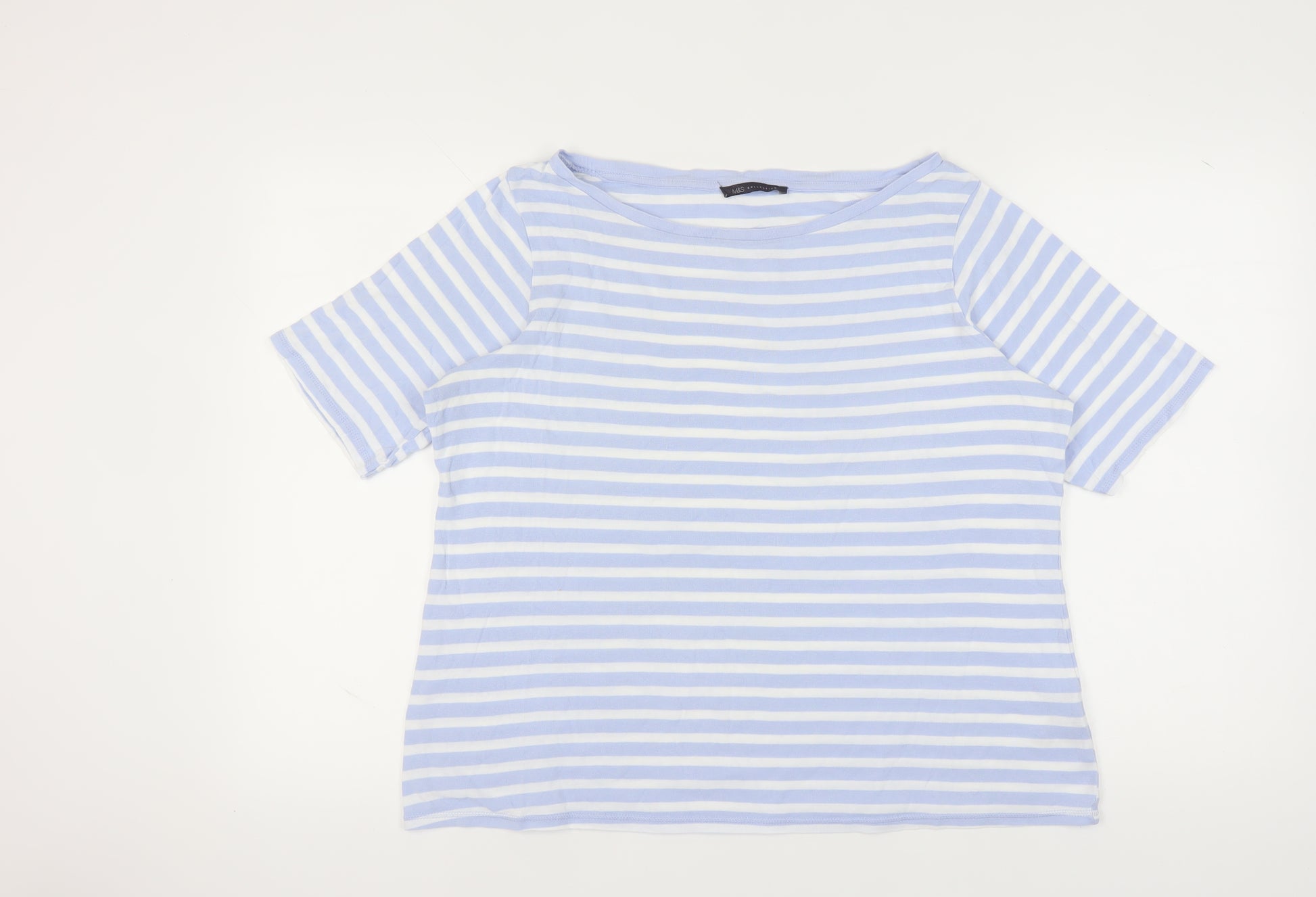 Elevate your wardrobe with this classic and versatile women's T-shirt from Marks and Spencer. Crafted with the utmost care, this blue striped T-shirt is made from 100% cotton, offering a comfortable and breathable fit that's perfect for casual occasions. The boat neck design adds a touch of elegance, making it ideal for pairing with jeans or skirts for a stylish look. Featuring short sleeves for a perfect spring or summer ensemble, this T-shirt is designed with easy care in mind, ensuring it remains a staple in your wardrobe for seasons to come. Whether you're heading for a relaxed weekend outing or a casual day at work, this regular fit T-shirt offers the perfect blend of style and comfort. The soft jersey fabric and striped pattern present a timeless aesthetic that’s both modern and classic. New with tags, you can be assured of its pristine quality, making it a great addition to your collection or as a thoughtful gift for a friend. Don't miss out on this essential piece that seamlessly combines simplicity with style.