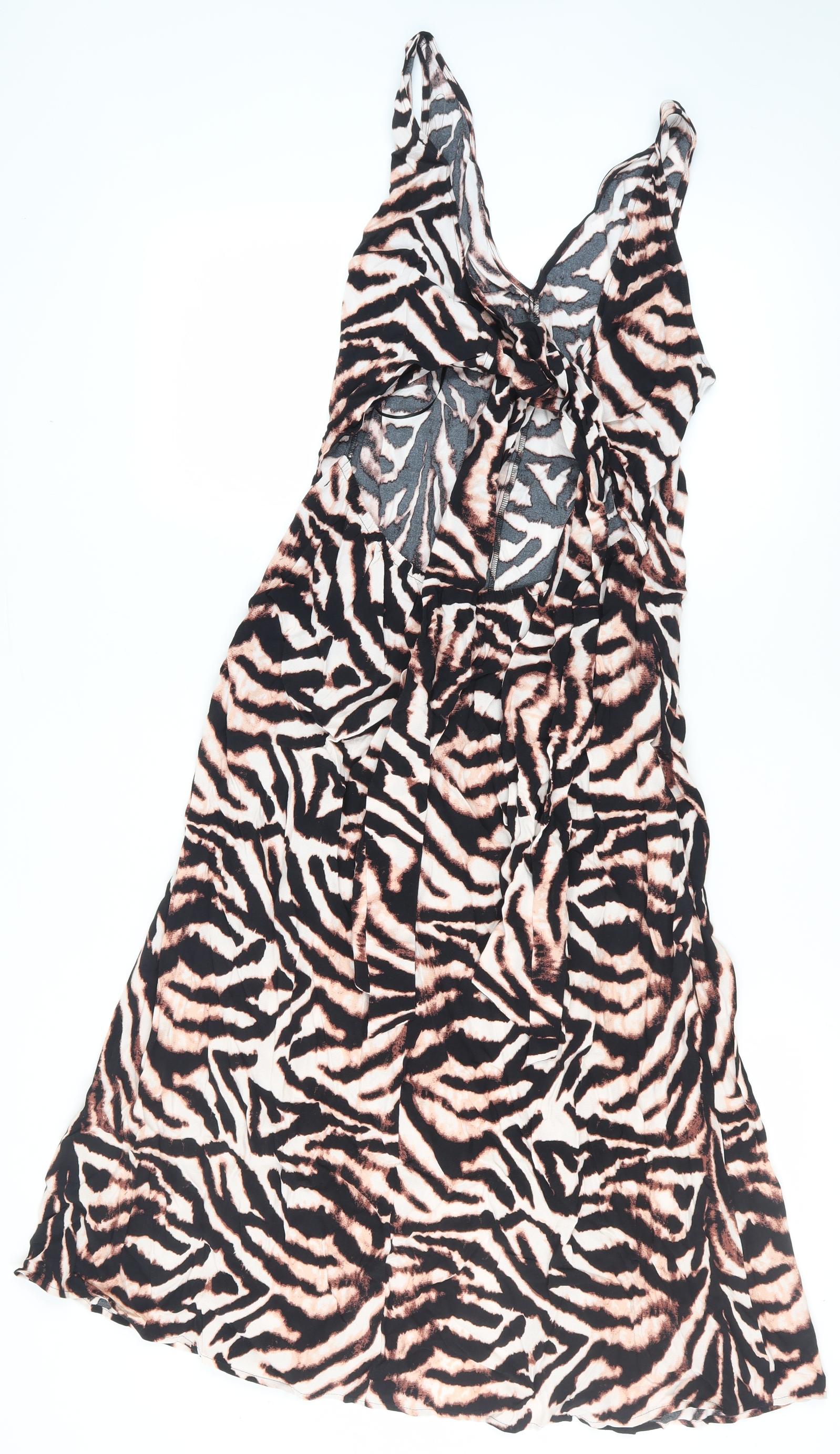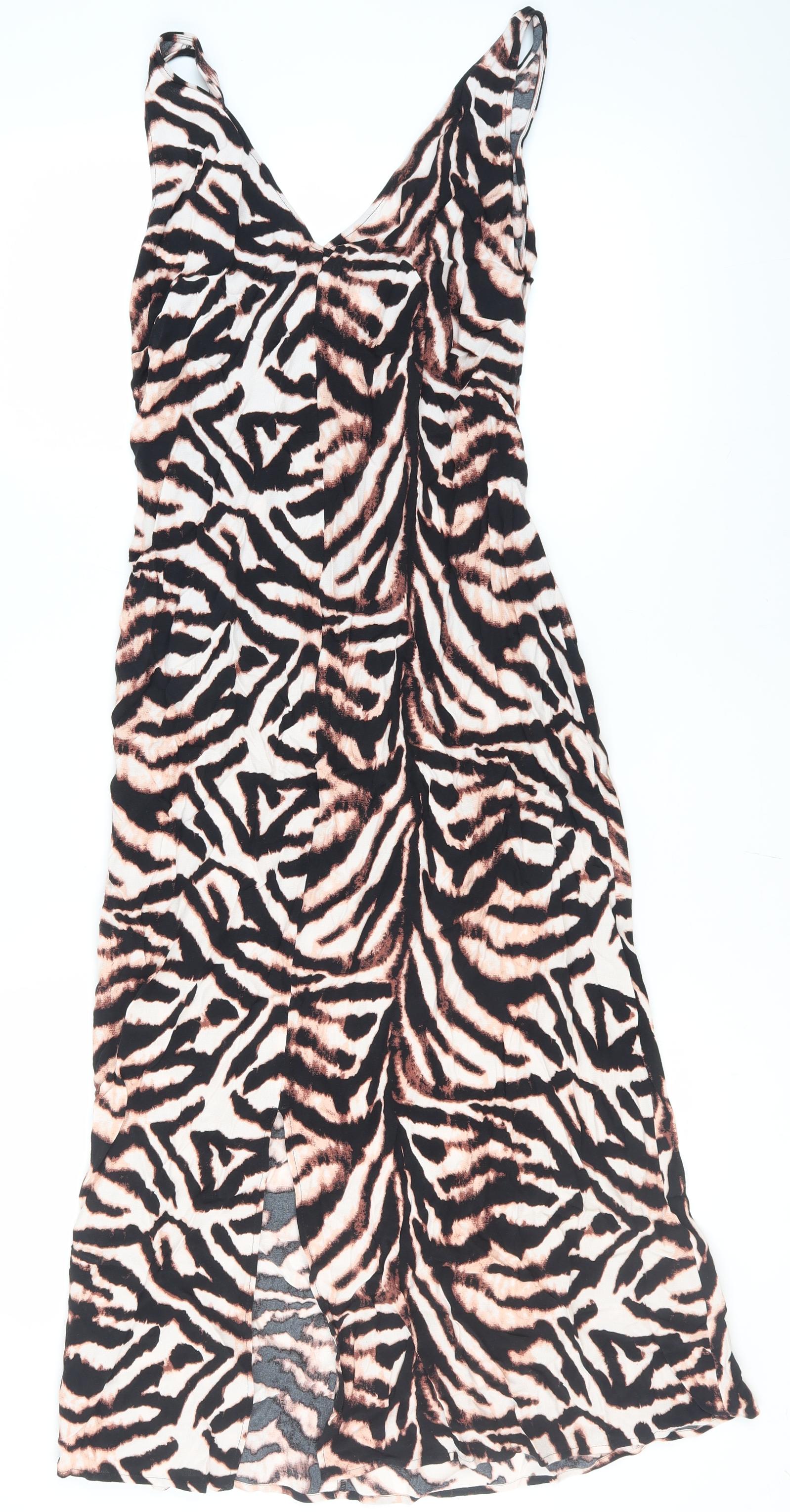 Explore your wild side with this striking Marks and Spencer animal print dress. Perfectly tailored for modern sensibility, this dress features a captivating blend of brown hues in a bold animal print pattern, making it a statement piece for fashion-forward women. Crafted from a lightweight, woven viscose fabric, it ensures a comfortable fit and elegant drape. The strappy sleeves add a touch of summer charm, making it ideal for casual outings or special occasions. Its sleeveless design complements the regular size 14 fit, offering a flattering silhouette that suits various body types. Whether you're heading to a party or a casual gathering, this dress is your go-to choice for effortless style. Pair it with your favourite accessories and step out in confidence. Machine washable for easy garment care, this dress promises simplicity and style in one package. Don't miss out on this versatile wardrobe addition.