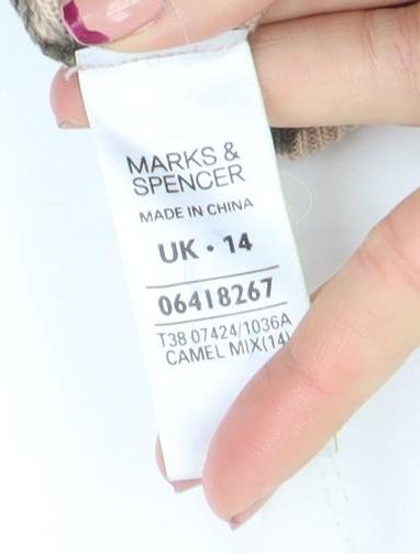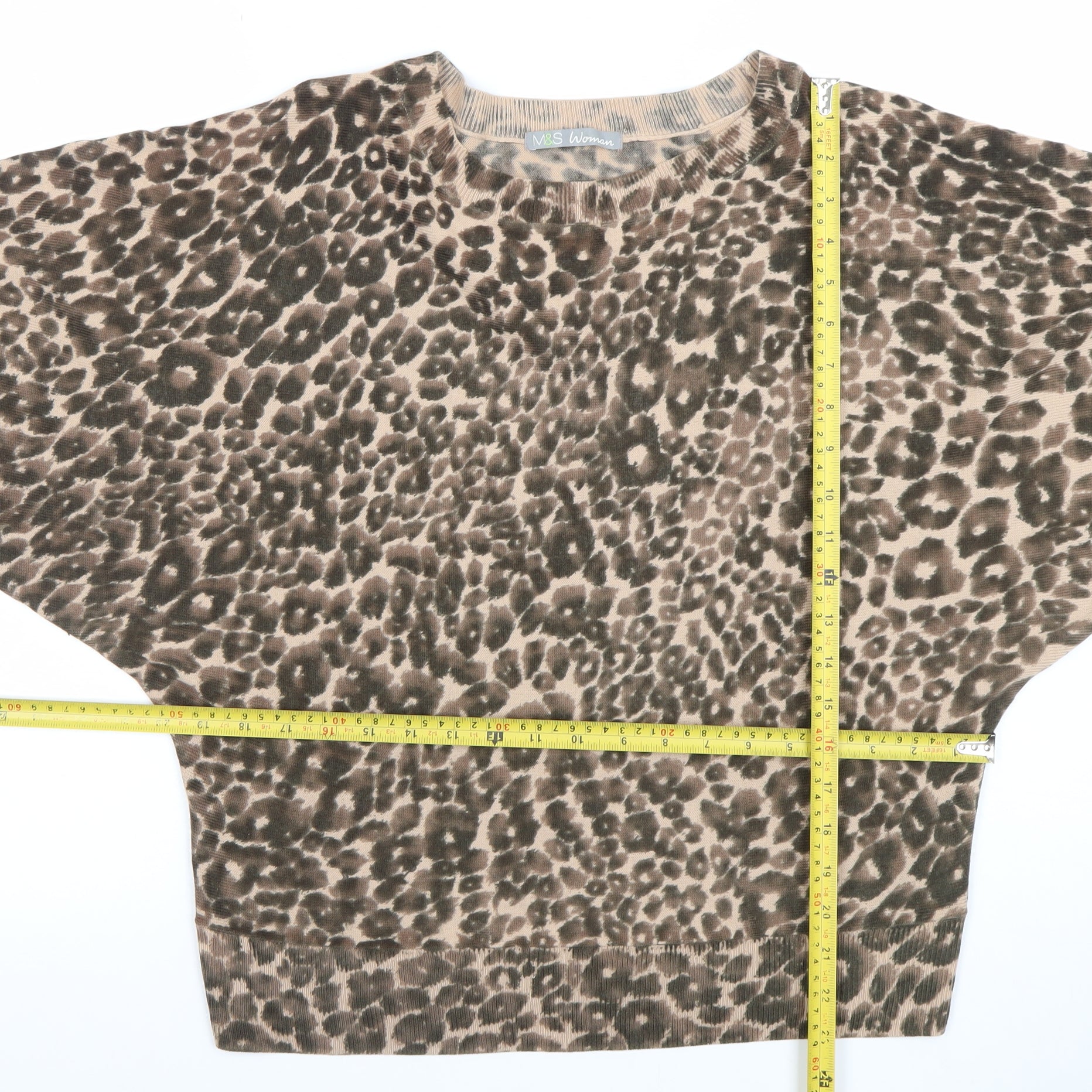 Add a bold yet elegant touch to your wardrobe with this stunning Marks and Spencer Women's brown animal print knit top in size UK 14. Crafted from a soft and comfortable blend of cotton and camel hair, the fabric feels luxurious against the skin while offering a lightweight, breathable texture perfect for layering through the cooler months. With its relaxed fit and pullover design, this top effortlessly combines comfort and style, making it an ideal choice for everyday wear or smart-casual occasions. The striking animal print pattern in natural brown tones adds a stylish edge, delivering a hint of sophistication to a classic design. Long dolman sleeves lend a relaxed, modern silhouette, while the crew neckline offers a timeless finish that pairs beautifully with jeans, tailored trousers, or a skirt. Subtle ribbed detailing at the cuffs and hem give a neat, refined look that enhances both comfort and structure. Whether worn for casual outings, cosy weekends, or even layered for workwear, this top provides versatile styling that transitions seamlessly across seasons. Designed for women who appreciate quality craftsmanship, Marks and Spencer ensures durability and premium comfort in every piece. This garment is machine washable for easy care, allowing you to maintain its impeccable shape and soft texture with minimal effort. Perfect for autumn and winter, this relaxed-fit knit carries an effortless charm — warm, stylish, and endlessly wearable. In excellent pre-loved condition with minimal signs of wear, it offers timeless appeal at a fantastic value. Ideal for adding personality and texture to your everyday look, this piece will quickly become a go-to item in your collection.