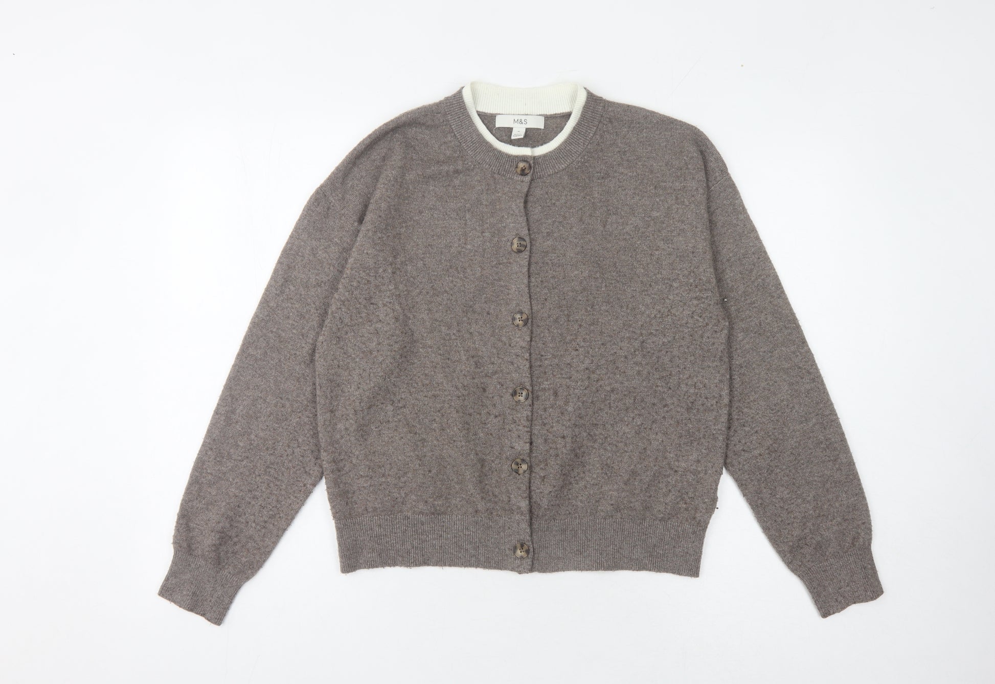 Elevate your wardrobe with this classic brown cardigan from Marks and Spencer, designed for women who appreciate elegance and comfort. This medium-sized cardigan is perfect for casual occasions, offering a relaxed yet stylish look. Crafted from a soft blend materials, including polyester, acrylic, elastane, and wool, it ensures long-lasting wear and warmth. The cardigan features a button accent and long sleeves, perfect for layering over your favourite tops in any season. Its machine washable nature makes it easy to care for, ensuring that it retains its quality and fit over time. With its neutral brown tone and timeless design, this cardigan is a versatile piece that can effortlessly transition between different outfits and settings. Don't miss the chance to add this Marks and Spencer cardigan to your collection – a piece that combines practicality with style.