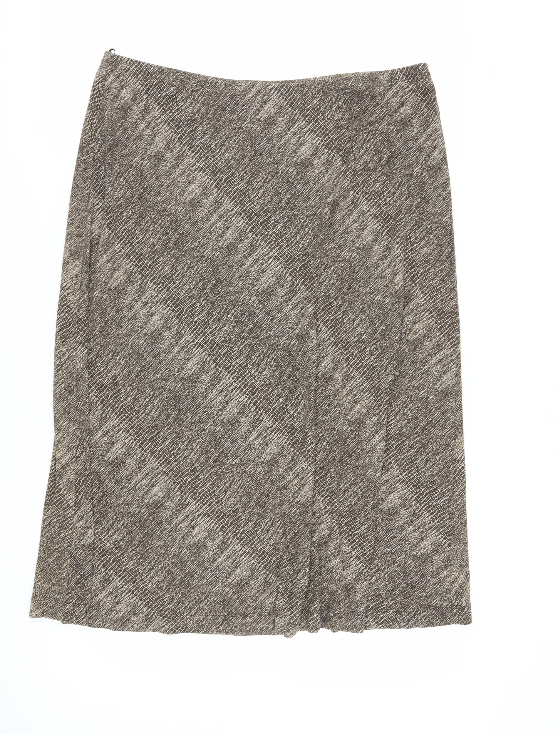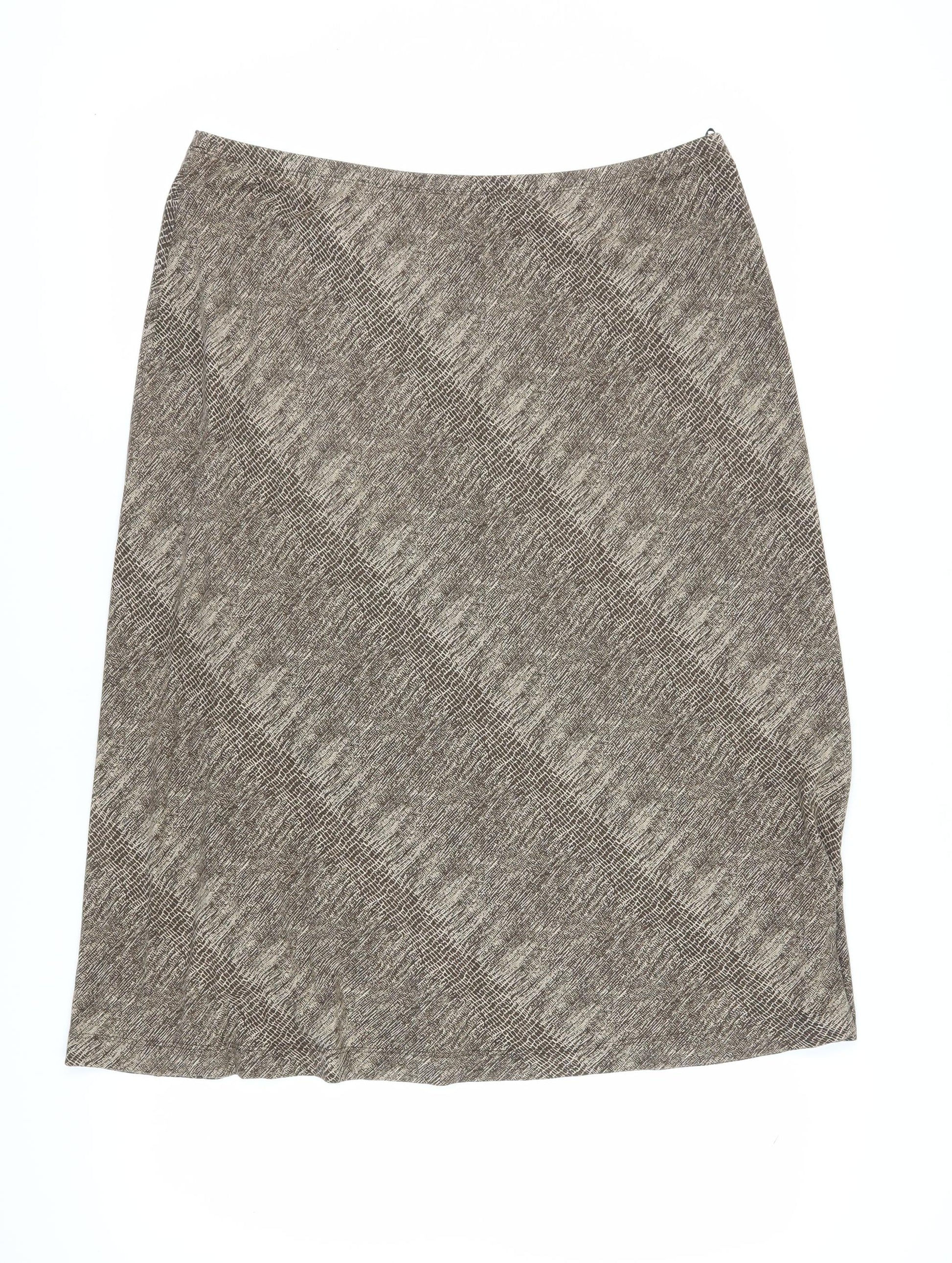 Discover this chic Marks and Spencer knee-length skirt in a classic brown geometric pattern. Crafted from a comfortable blend of viscose and elastane, this skirt is designed for both style and comfort. The straight and pencil style perfectly complements any figure, making it an ideal choice for casual occasions or a stylish addition to your workwear collection. Featuring a mid-rise fit, it pairs effortlessly with various tops for versatile styling options. Machine washable for ease of care, this skirt is perfect for autumn and winter wardrobes. In excellent condition, and available in size 18, it’s a must-have piece from a reputable brand known for its quality and style. Whether you're dressing for a day out or a relaxed office environment, this skirt offers a polished look with minimal effort.
