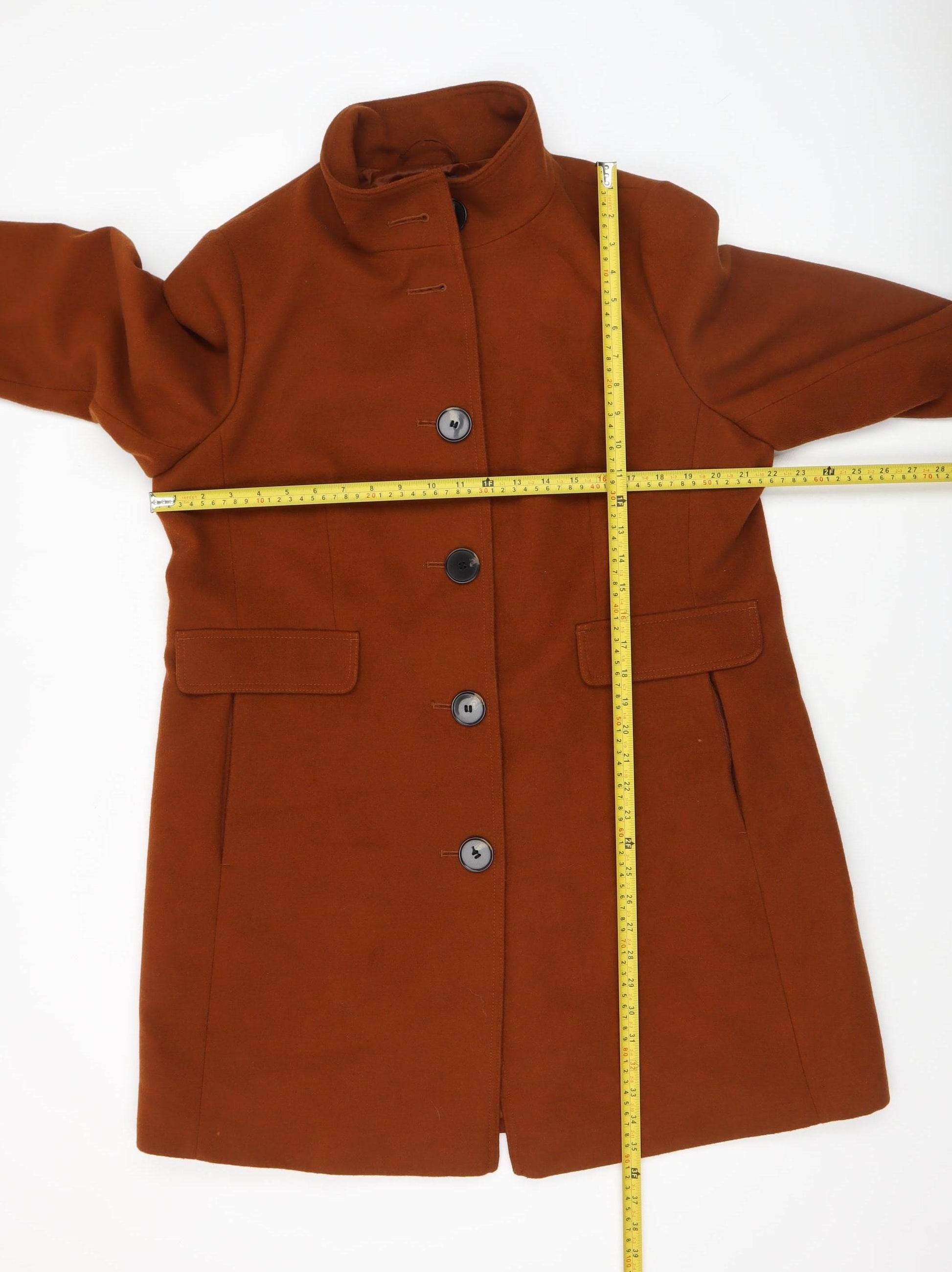 Elevate your outerwear collection with this timeless brown mid-length coat from Marks and Spencer. Designed with sophistication and practicality in mind, this coat is tailored for women who appreciate classic styling with modern comfort. It features a flattering structured fit with a stand collar and a traditional button closure for a polished finish. Two front flap pockets add both function and style, offering space for small essentials while enhancing the coat’s refined silhouette.Crafted from a high-quality blend of polyester, viscose, and elastane, the fabric ensures warmth, durability, and a comfortable touch. The smooth polyester lining provides an easy layer over any outfit, allowing effortless wear throughout autumn and winter. The clean lines and minimalist design make it a versatile piece — ideal for pairing with both formal workwear and smart casual ensembles.Perfect for the colder seasons, this M&S Collection coat offers both warmth and elegance while maintaining a timeless aesthetic that seamlessly complements any wardrobe. The rich brown hue blends beautifully with neutral tones or bold accessories, giving you styling flexibility for various occasions. Whether you’re heading to the office, attending a business meeting, or enjoying an evening out, this coat will leave a lasting impression for its understated refinement.With its expertly tailored fit, quality materials, and enduring style, this Marks and Spencer coat embodies the brand’s renowned commitment to everyday luxury and practicality. An excellent pre-owned example, this piece remains in outstanding condition, showing only minimal signs of wear. A smart investment for style-conscious women, offering enduring sophistication season after season.