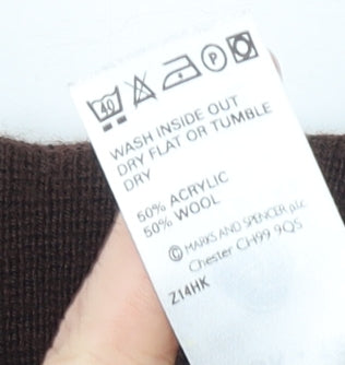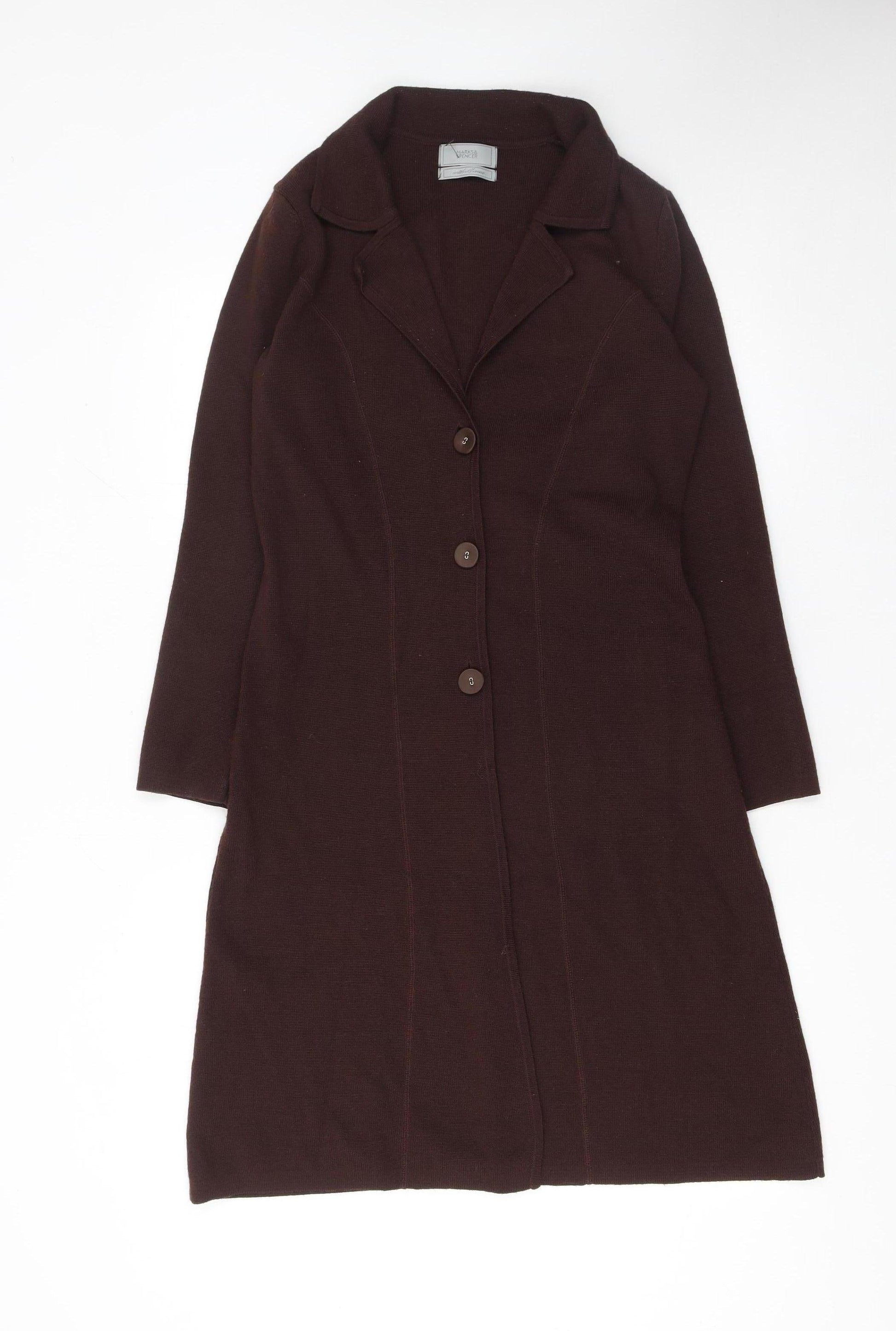 Wrap yourself in timeless elegance with this Marks and Spencer women’s long cardigan in a deep, rich brown hue. Crafted from a warm wool blend fabric, this cardigan is ideal for layering during the colder months, offering both comfort and sophistication. Its flattering tailored cut, button fastening, and collared neckline give it a structured silhouette, making it versatile enough for smart casual occasions or office wear. The combination of 50% acrylic and 50% wool ensures durability while maintaining softness against the skin. Designed for a women’s UK size 12, this cardigan offers a regular fit with full-length sleeves that provide warmth and ease of movement. The knit construction enhances flexibility while retaining shape after wear. The longline design finishes mid-thigh, creating a sleek and refined profile that pairs seamlessly with jeans, dresses, or tailored trousers. Suitable for autumn and winter, this piece transitions effortlessly from office meetings to relaxed weekend outings. Its brown tone complements neutral accessories, while the simple button accents complete the minimalist design. In good pre-loved condition, this wool-blend cardigan shows minor wear consistent with gentle use, including a faint mark near the hem that does not detract from its overall charm. Perfect for anyone seeking a quality Marks and Spencer staple at an affordable price, it embodies the brand’s reputation for understated elegance and long-lasting style. Add this piece to your wardrobe today for effortless layering, everyday warmth, and timeless chic appeal that will see you through the seasons in style and confidence.