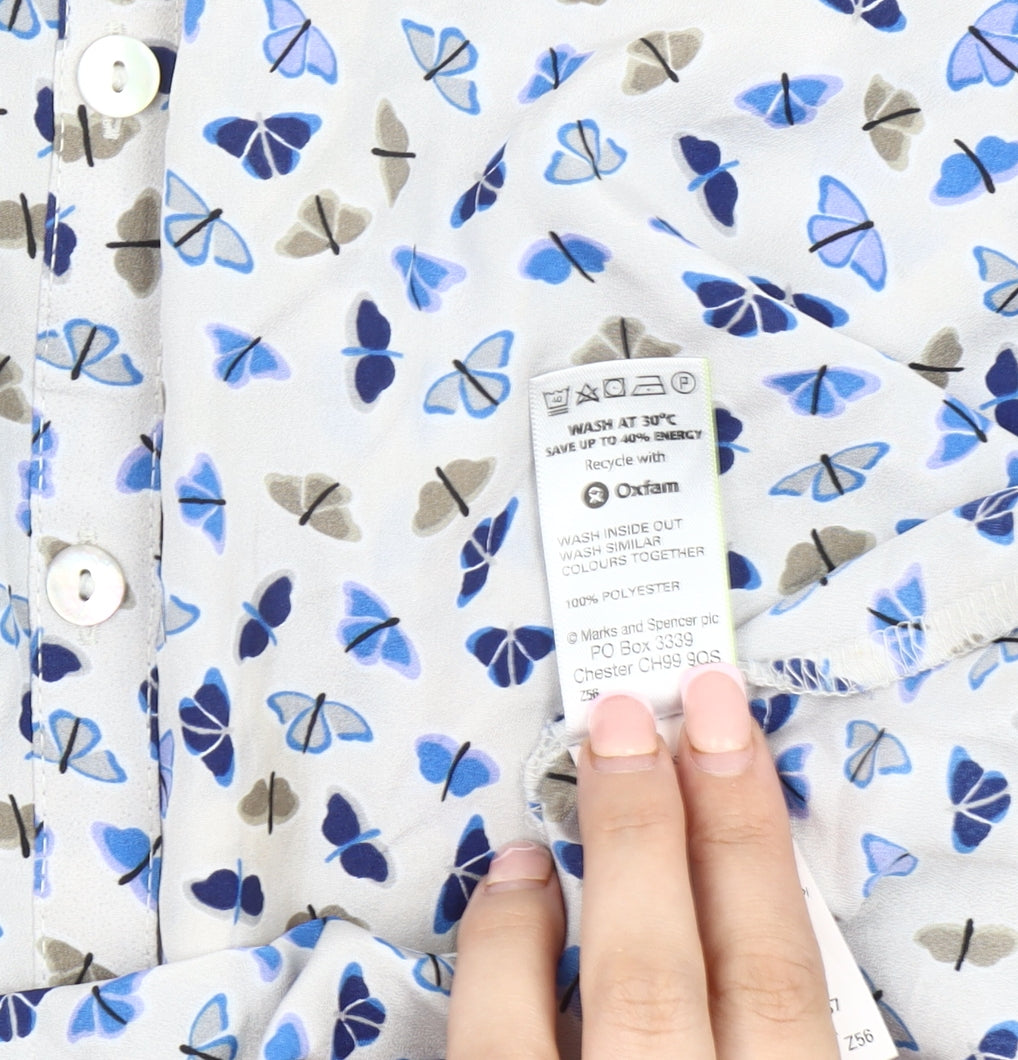 Enhance your wardrobe with this delightful Marks and Spencer Women's Butterfly Blouse. Styled in a charming multicoloured butterfly pattern, this blouse is a perfect choice for casual outings during the vibrant seasons of spring and summer. Made from 100% polyester, it ensures a lightweight and comfortable fit while maintaining a classic style appropriate for nearly any casual occasion. The 3/4 puff sleeves add a touch of elegance to the round neck design, creating a seamless blend of style and comfort. The button closure makes it easy to wear, and its regular size type assures a flattering fit for women. This blouse's floral theme, featuring radiant butterflies, infuses a sense of nature-inspired freshness. It's machine washable, ensuring easy care and convenience for your everyday lifestyle. Offered in excellent condition, this blouse displays no visible wear, exemplifying Marks and Spencer's premium quality. Add it to your collection and enjoy the effortless blend of style and nature. Priced attractively, it's a must-have staple for any fashion-forward woman.