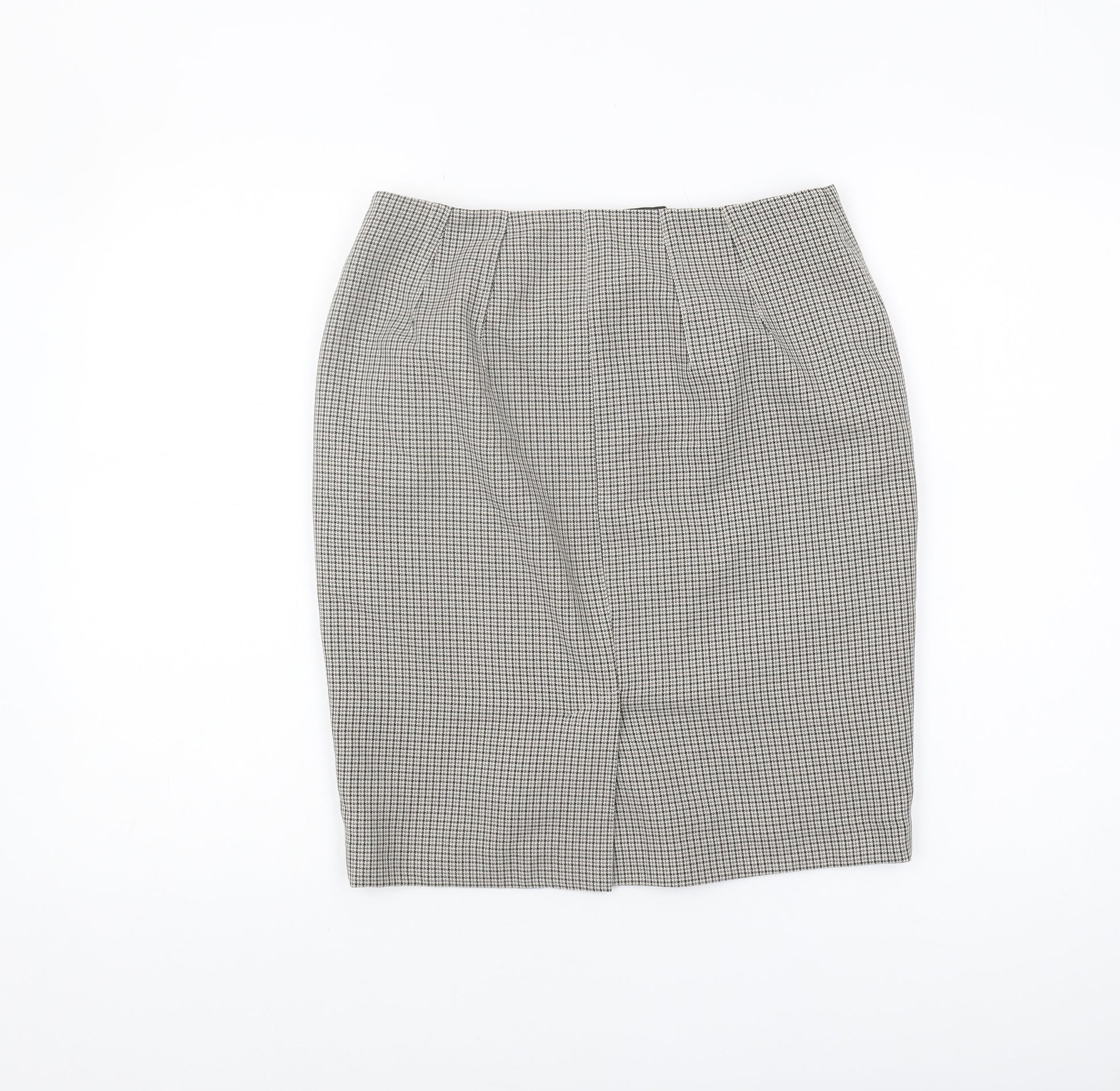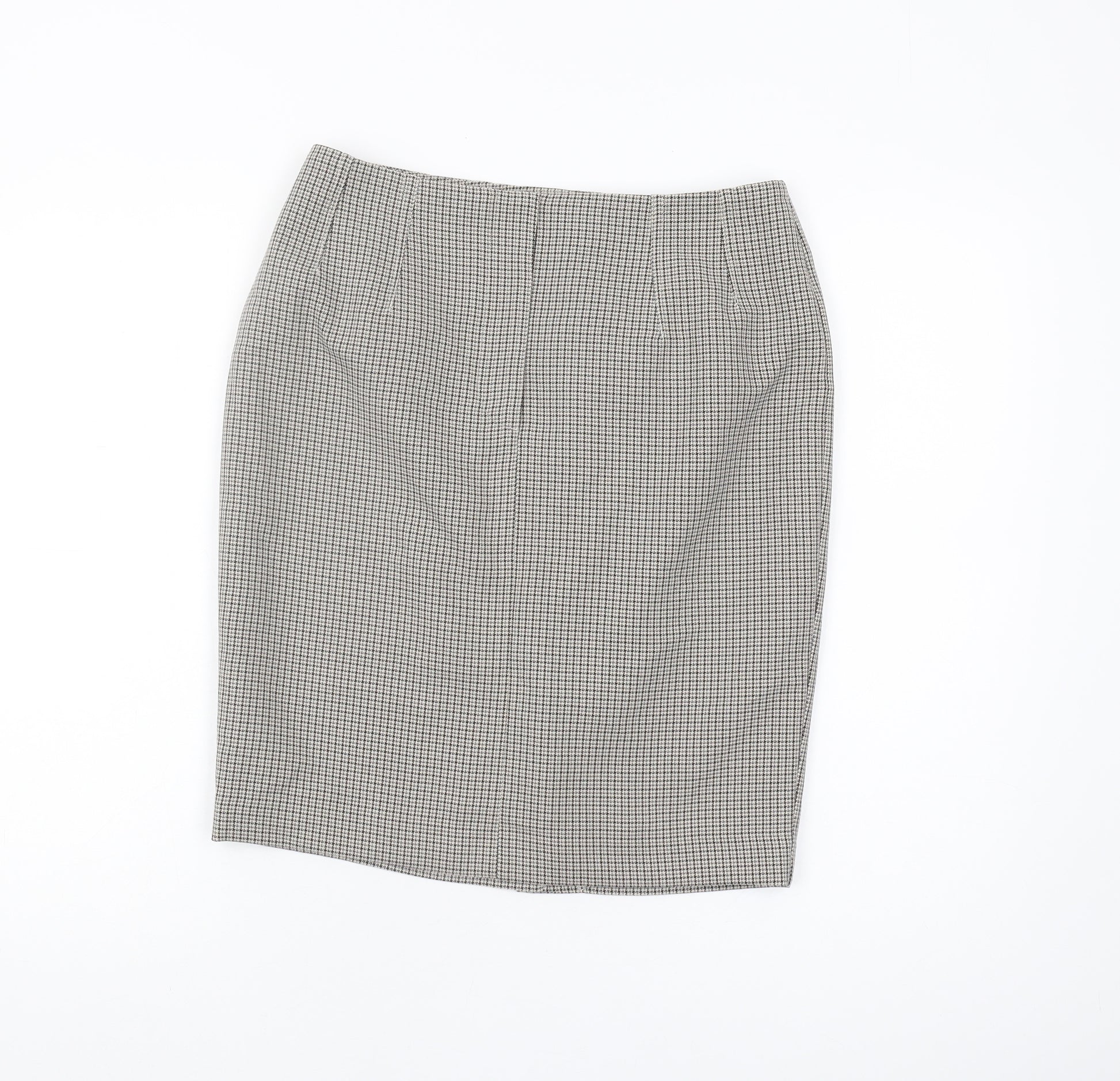 Step into style with this Marks and Spencer Women's Check Pencil Skirt. Designed for those who appreciate classic elegance and comfort, this skirt is a staple for any wardrobe. Crafted for the modern woman, it presents an impeccable finish with its knee-length cut and refined straight & pencil style. This black checked skirt is versatile enough to complement your favourite tops and accessories, perfect for transitioning effortlessly between casual and formal occasions. Made from a premium blend of 89% polyester and 11% viscose, it offers durability while maintaining a soft, smooth feel against the skin. This skirt, available in size 10, features a classic pattern that adds a touch of sophistication to your look. Its easy-care nature allows you to machine wash it without a worry, ensuring convenience alongside style. Whether you're at the office or attending a social gathering, this skirt exudes confidence and class. Conditioned to excellent standards, with no visible defects, it stands ready to enhance your seasonal wardrobe. Priced attractively, this elegant skirt is an affordable luxury you can cherish across various occasions, from business meetings to evening dinners.