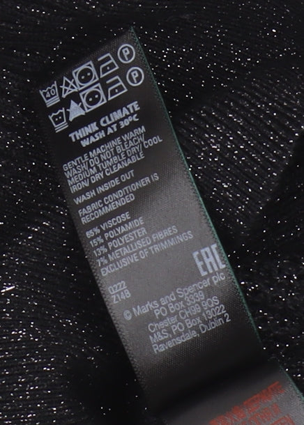 Elevate your wardrobe with this classic black jumper from Marks and Spencer, designed specifically for women who appreciate style and comfort. This elegant piece features a sophisticated collared neckline that adds a touch of class to any outfit. The jumper is carefully crafted from a blend of viscose, polyamide, polyester, and metallic fibre, ensuring a soft yet durable fit. Its long sleeves and knit fabric provide warmth, making it an ideal choice for cooler seasons. The absence of a pattern and sleek black hue allow for effortless pairing with any ensemble, whether it’s a casual day out or a formal evening event. Enhance your wardrobe with this versatile women's jumper, which combines timeless elegance with contemporary style, and enjoy a seamless fusion of quality and fashion.