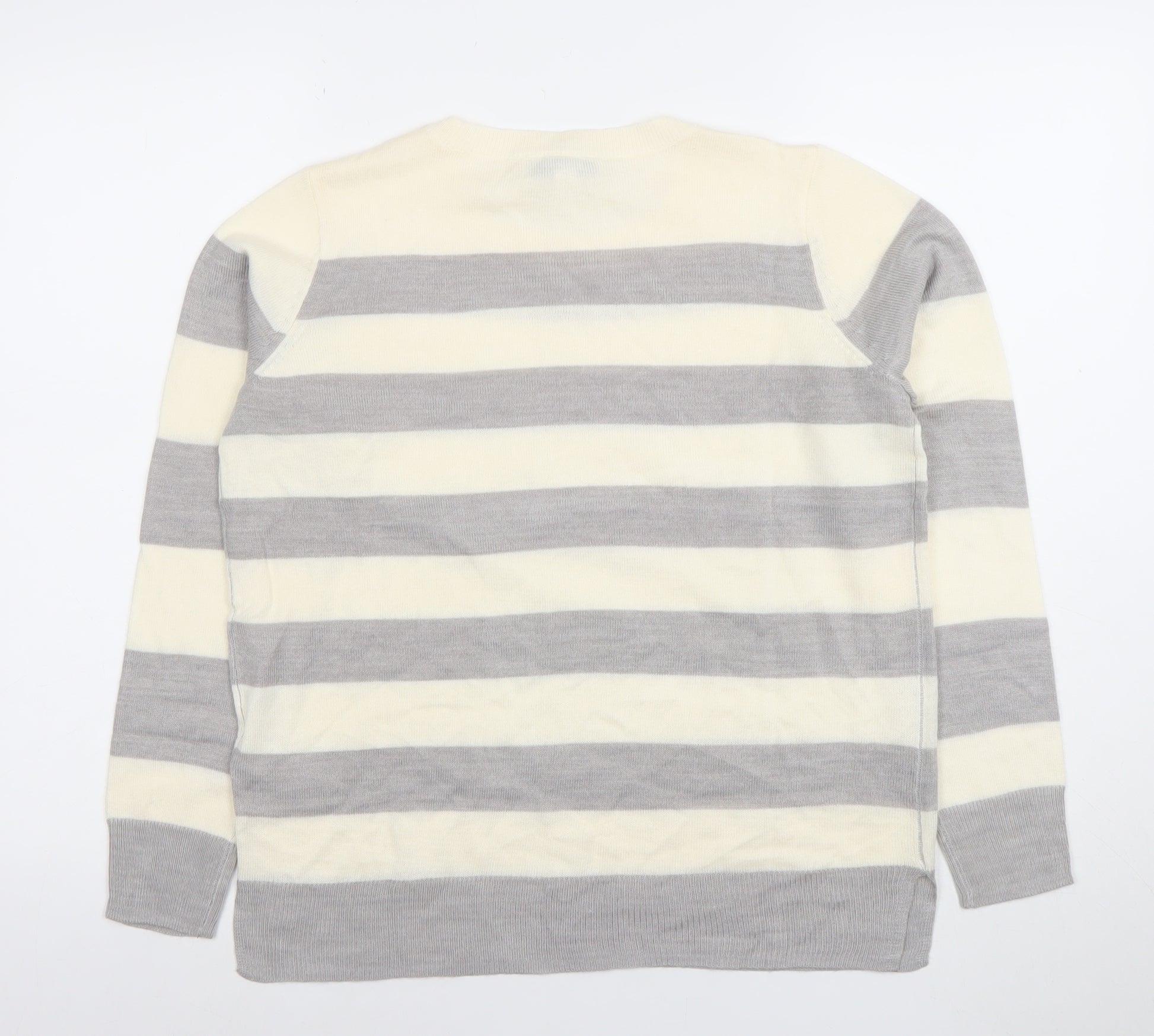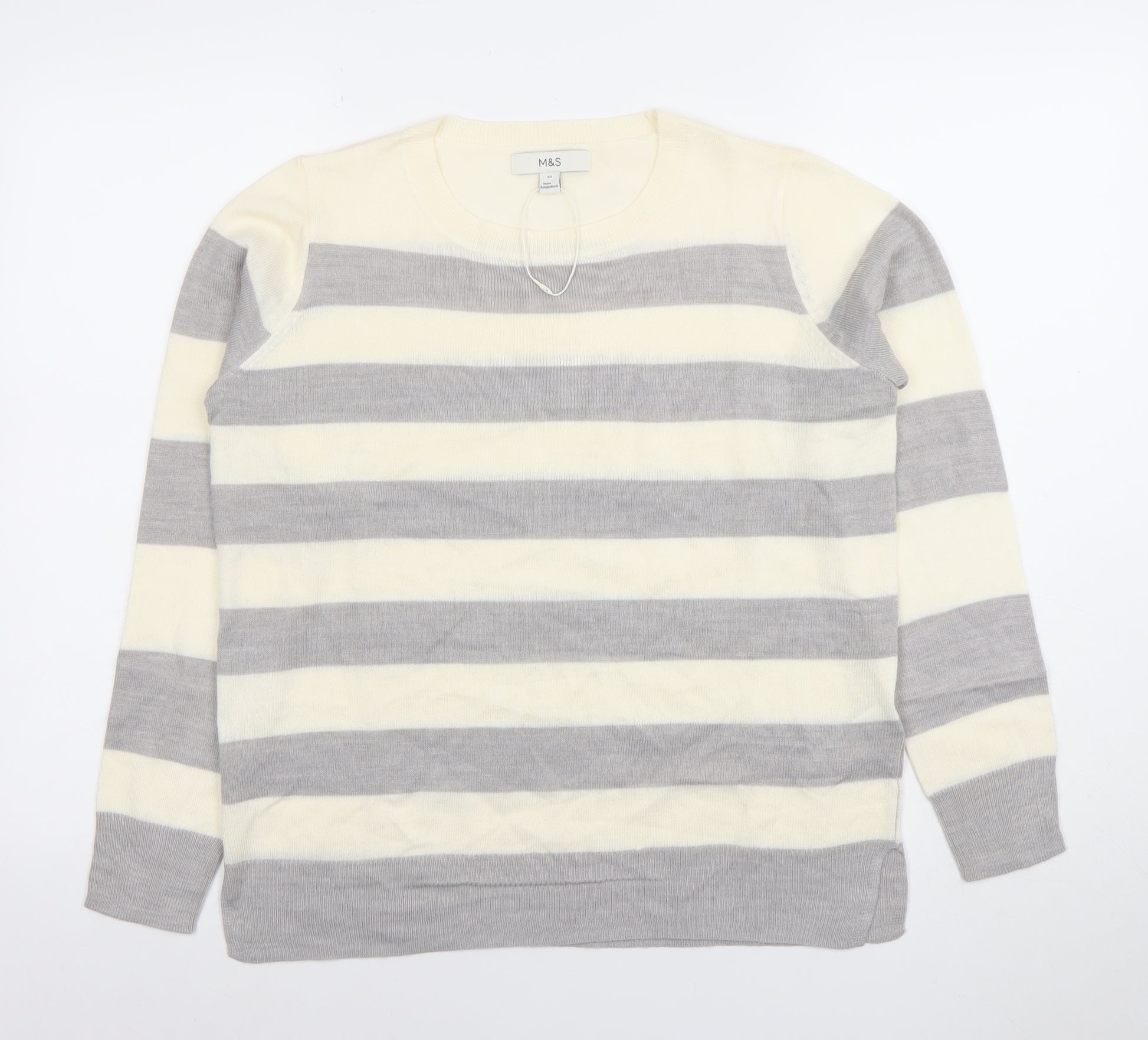 Refresh your everyday wardrobe with this classic Marks and Spencer women’s striped jumper in timeless cream and grey tones. Crafted from 100% acrylic, it offers a soft, lightweight knit that delivers warmth without bulk — ideal for layering through the transitional seasons. The jumper features a comfortable crew neckline and long sleeves for a cosy, flattering fit, while the neat ribbed hem and cuffs add structure and shape. Perfect for casual wear, this relaxed yet refined pullover pairs beautifully with jeans, skirts, or tailored trousers for effortless smart-casual styling. Designed in a regular fit, it shapes naturally on the body, allowing easy movement and lasting comfort throughout the day. The contemporary horizontal stripe pattern brings a modern, nautical-inspired look, making it a versatile option that works just as well at home, in the office, or out for a coffee with friends. Machine washable for practicality and designed to maintain its softness and shape after repeated washes, this knitwear essential balances durability with timeless appeal. Great for autumn through spring, its breathable yet insulating properties make it an everyday favourite for the woman who values both style and comfort. Though pre-loved, this garment is in excellent condition with minimal signs of wear, retaining its original quality and finish. Add effortless sophistication to your wardrobe with this Marks and Spencer striped jumper — a staple piece that never goes out of fashion. Grab it now to enhance your knitwear collection with a versatile and comfortable piece perfect for casual yet polished styling throughout the cooler months.