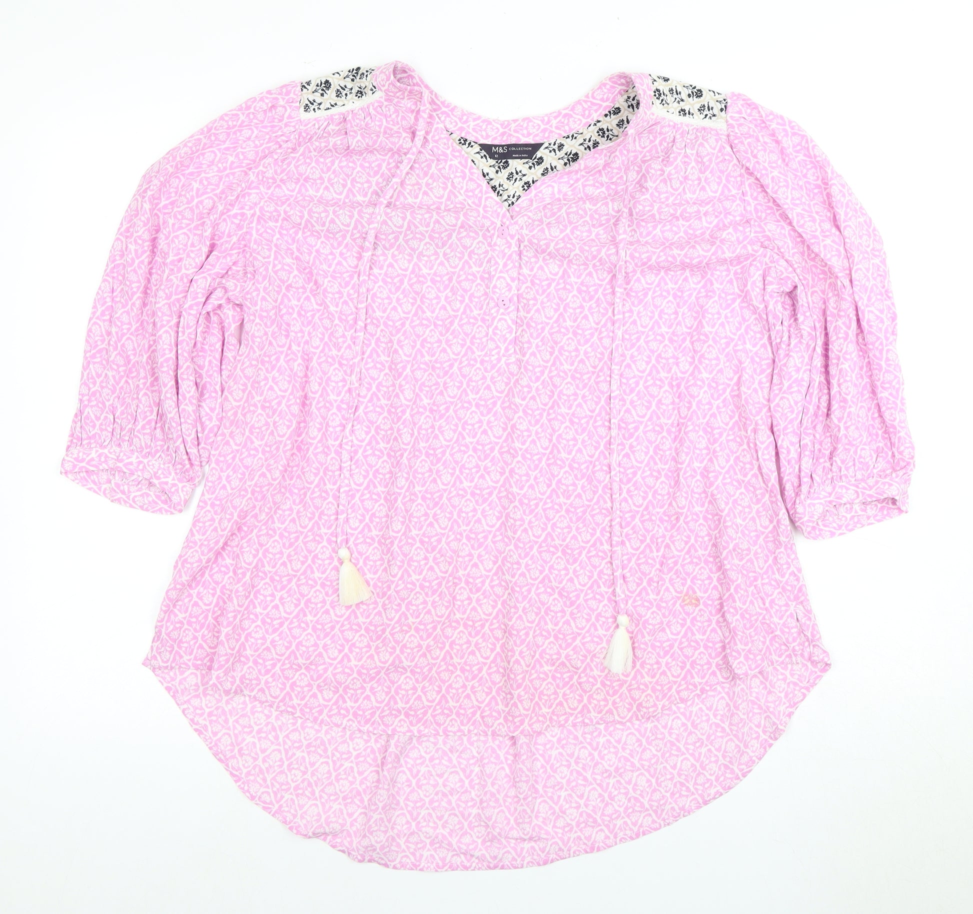 This Marks and Spencer Collection blouse is designed for stylish women who want to blend comfort and fashion seamlessly. Made from 100% cotton, this tunic blouse features a beautiful multicoloured floral pattern, perfect for seasonal transitions. The woven fabric, accented with a charming tassel detail, gives it a lightweight feel that is ideal for spring and summer outings. Its 3/4 casual sleeves and round neckline offer a relaxed yet polished look, while its pullover closure ensures easy wear. The regular fit makes it a versatile piece for various occasions, allowing you to dress it up for casual gatherings or keep it laid-back for everyday comfort. Whether you're strolling in the city or enjoying a brunch with friends, this blouse provides effortless style.