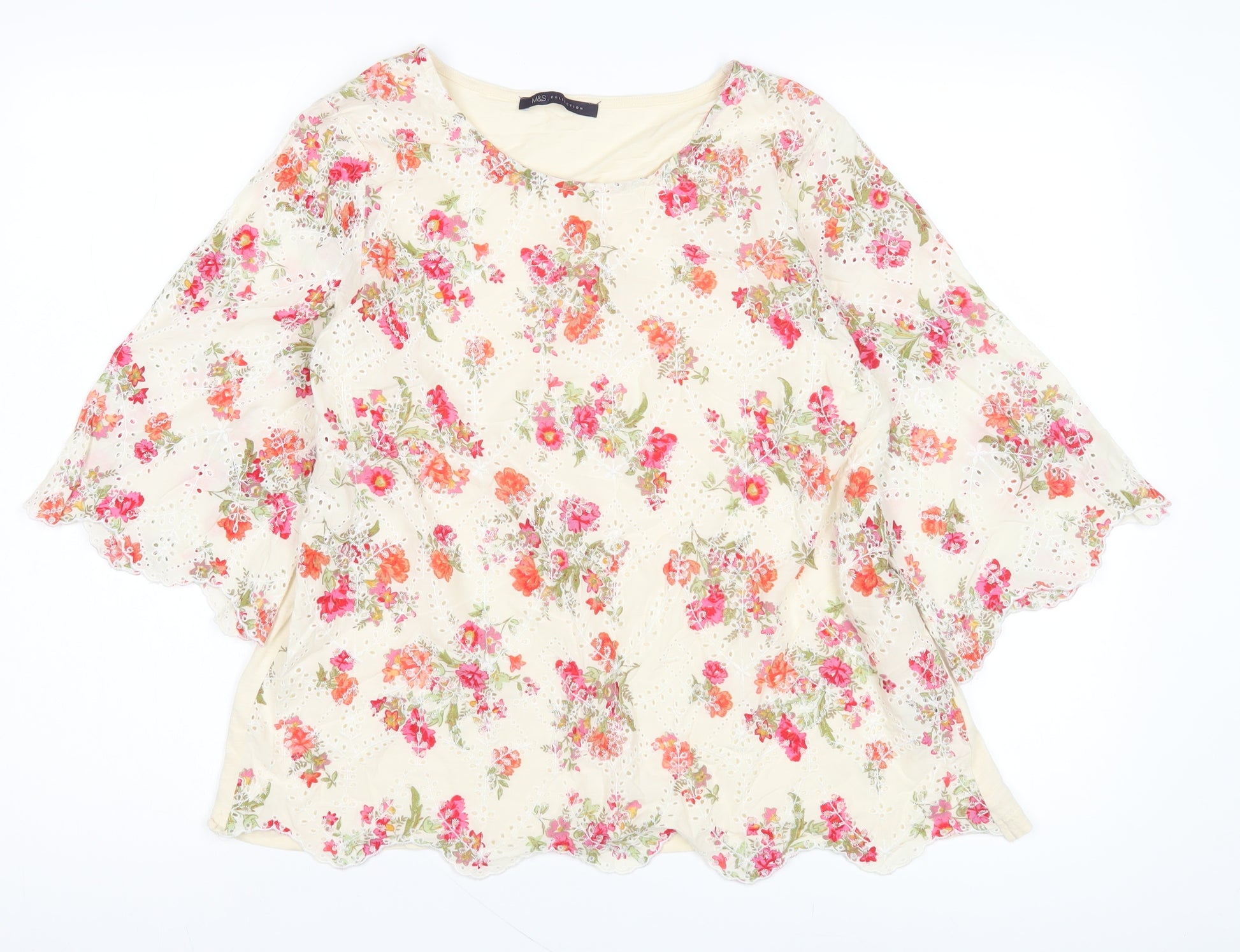 Embrace elegance and femininity with this exquisite Marks and Spencer women's blouse, perfect for those warmer seasons. Crafted from 100% cotton, it promises comfort and breathability, with embroidered accents that add a touch of sophistication to its beautiful floral pattern. The multicoloured design in a regular fit ensures it pairs well with a variety of bottoms, making it a versatile addition to your wardrobe. The 3/4 flutter sleeves and round neckline offer a chic aesthetic, while the pullover closure provides ease of wear. Ideal for casual occasions, this blouse makes a statement in any setting. With a machine-washable design for easy care, it's the perfect blend of practicality and style. Available in size 14, it’s the epitome of Marks and Spencer's trusted quality, bringing a fresh, vibrant look to your spring or summer outfit choices.