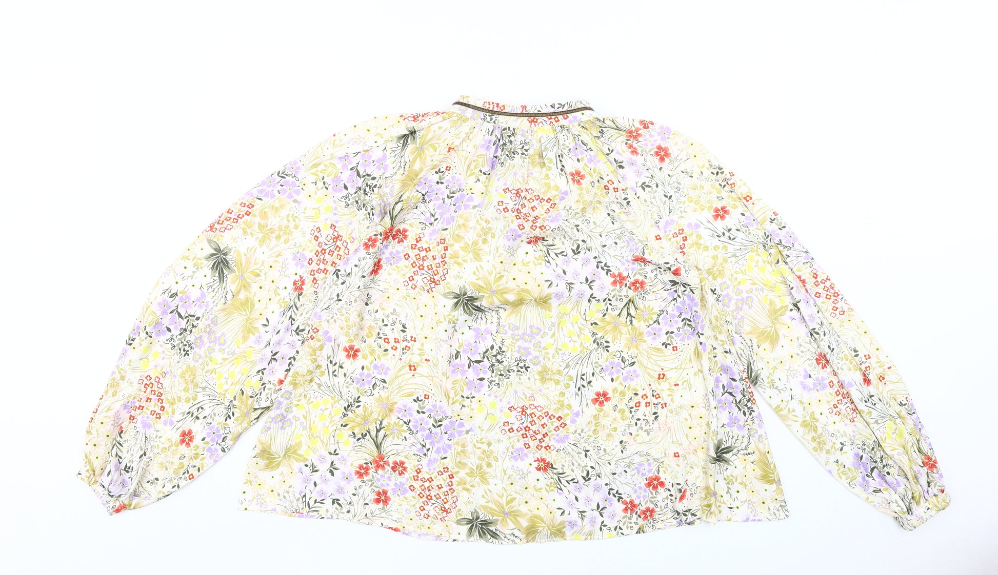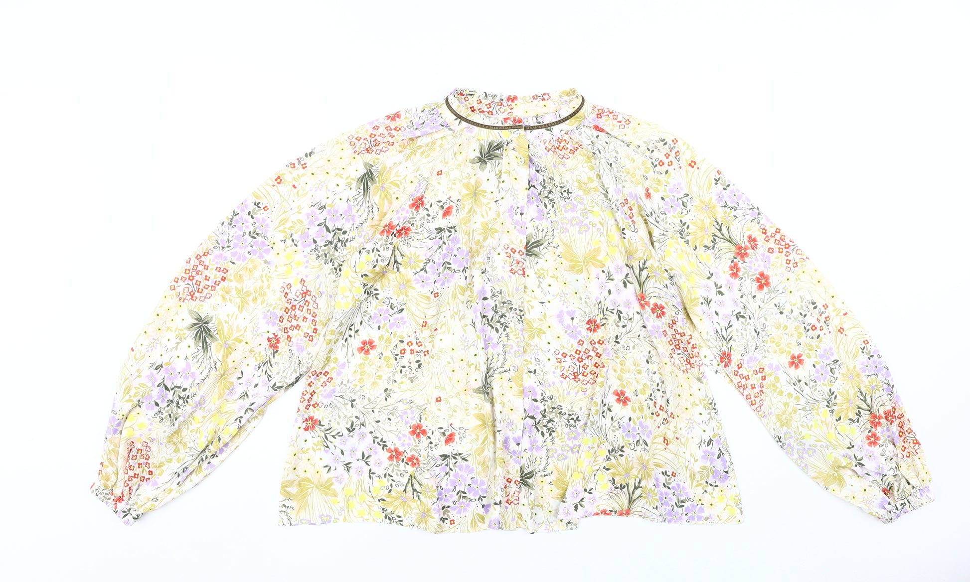 This exquisite Marks and Spencer floral blouse is a perfect addition to your wardrobe, ideal for casual or semi-formal occasions. Crafted exclusively from high-quality polyester, it ensures comfort and durability while maintaining a sleek look. The blouse is designed with a flattering tunic style, featuring a beautiful multicoloured floral pattern that radiates elegance. Long fitted sleeves offer a classic touch, complemented perfectly by the crew neckline. Perfect for the spring and summer seasons, this blouse is a versatile choice whether you're heading to brunch or a casual outing with friends. Its easy-care feature means it's machine washable, ensuring convenience in every wear. Embrace the vibrant floral theme that resonates with a refreshing and youthful vibe. As a brand new item with original tags, this blouse promises quality and authenticity to elevate your style effortlessly.
