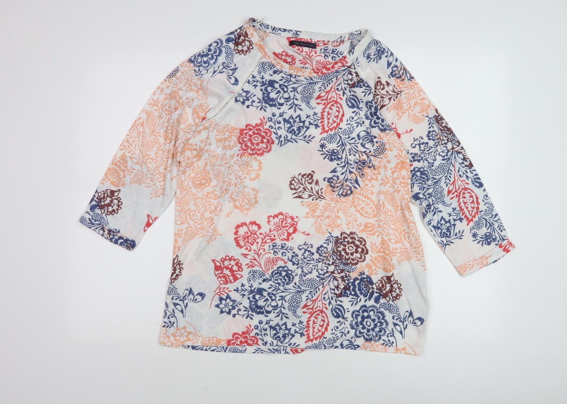 Elevate your casual wardrobe with this vibrant floral jumper from Marks and Spencer. Perfectly designed for women, this jumper features a striking multicoloured print, making it an ideal choice for both spring and summer. Crafted from a blend of polyester and linen, it offers the lightweight comfort of jersey fabric, while the round neckline and raglan 3/4 sleeves provide an effortless and relaxed fit. The jumper comes in a regular size 14 and is enhanced with a subtle zip accent, adding a touch of modern style. Machine washable for ease of care, this floral jumper is perfect for casual occasions, whether you're out shopping or meeting friends for coffee. Its excellent condition hints at minimal previous use, ensuring you receive a garment that feels almost brand new. Enjoy the blend of practicality and chic design with Marks and Spencer's beautiful floral jumper.
