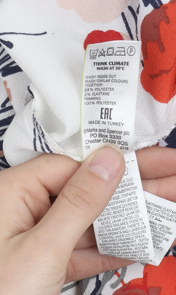 Upgrade your wardrobe with this elegant floral top from Marks and Spencer, perfect for injecting a pop of colour and style. Designed particularly for women who appreciate exquisite patterns, this multicoloured top features stunning floral artwork that stands out beautifully against any background. Made primarily from polyester with a hint of elastane, it offers just the right amount of stretch, ensuring a comfortable fit without compromising on style. The fabric feels luxurious against the skin and is easy to maintain, being machine washable for hassle-free care. Sized at 16 Petites, it's tailored for a flattering fit, enhancing your silhouette effortlessly.The classic crew neckline adds a touch of simplicity that complements the vibrant pattern, while also allowing for easy pairing with your favourite accessories. Although gently used, this top remains in excellent condition, with no visible signs of wear. Whether you're dressing up for a casual day out or a special occasion, this versatile piece fits seamlessly into any setting. Imagine pairing it with your go-to pair of jeans for a laid-back look, or teaming it with a skirt for a more polished ensemble. Despite previous use, it’s ready to make a fresh statement, offering a blend of comfort, quality, and timeless style.With a competitive price of just £12.00, this Marks and Spencer floral top presents great value. It’s an ideal choice for those who don’t want to pay a premium without sacrificing aesthetics or quality. Don’t miss out on adding this beautiful garment to your collection. Perfect for flower lovers or anyone looking to add a splash of artful detail to their everyday look. Order now and transform your style with this chic attire from a trusted brand.