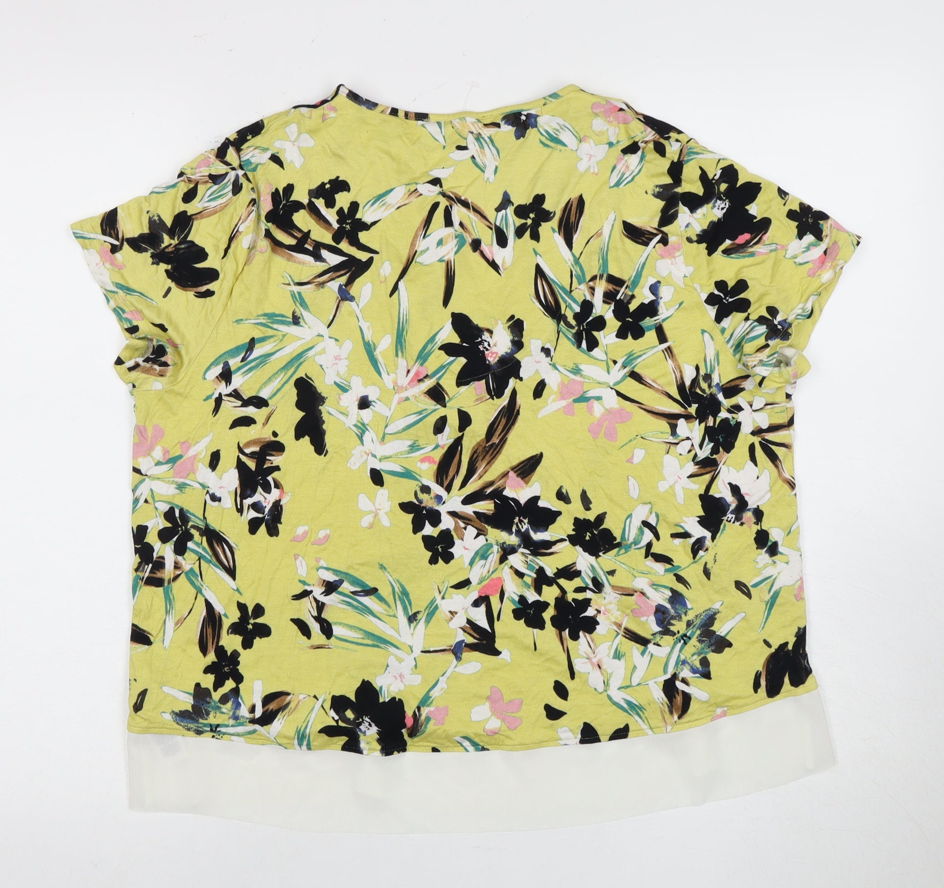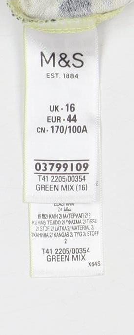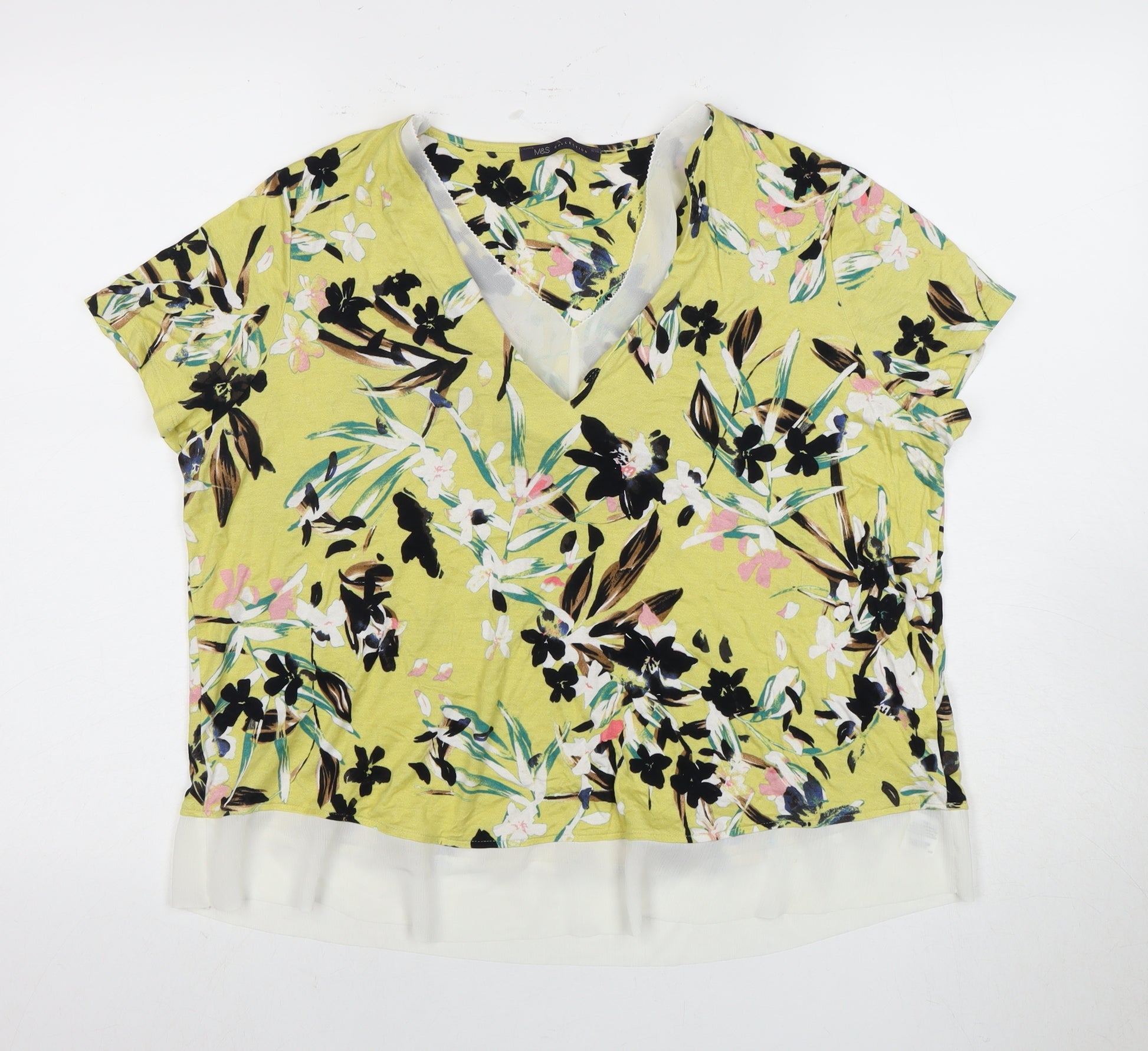 Elevate your wardrobe with this beautiful Marks and Spencer Women's Floral V-Neck T-Shirt in a striking multicoloured pattern. Perfectly blending style and comfort, this short-sleeve top features a flattering V-neckline that complements any body type. Crafted from a soft blend of viscose and elastane, it ensures a comfortable fit for all-day wear. The vibrant floral pattern adds a touch of elegance, making it ideal for both casual outings and more formal occasions. Whether paired with jeans for a relaxed look or a skirt for a chic ensemble, this T-shirt is versatile enough to suit any occasion. It's in excellent condition, with no visible wear or damage, offering great value at an affordable price. Don’t miss out on this essential addition to your collection.