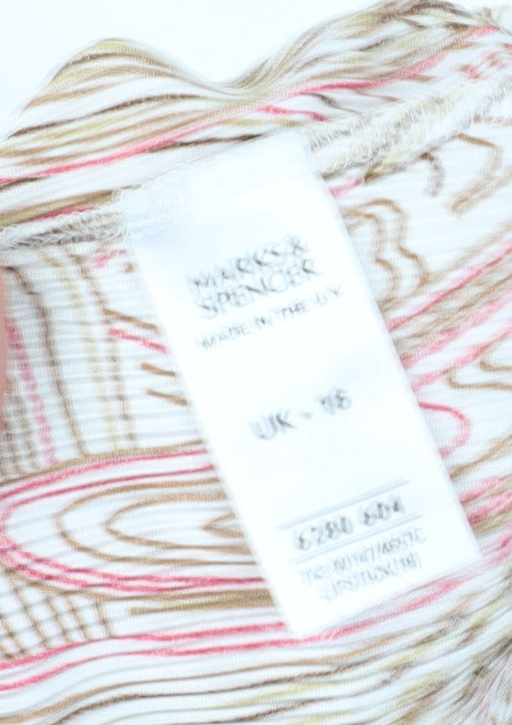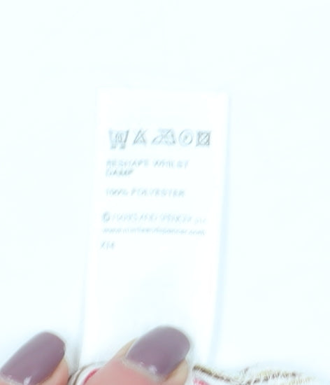 This elegant Marks and Spencer women's top features a captivating geometric pattern in a multicoloured palette, making it a versatile addition to your wardrobe. Ideal for both spring and summer, the lightweight polyester fabric ensures comfort throughout the day. Designed with a round neck and classic fitted short sleeves, this top is perfect for casual occasions. The pullover closure adds to its easy-wear appeal while maintaining a flattering regular fit. Machine washable for convenience, this piece is well-maintained with no signs of wear, offering a unique style without compromising on quality.
