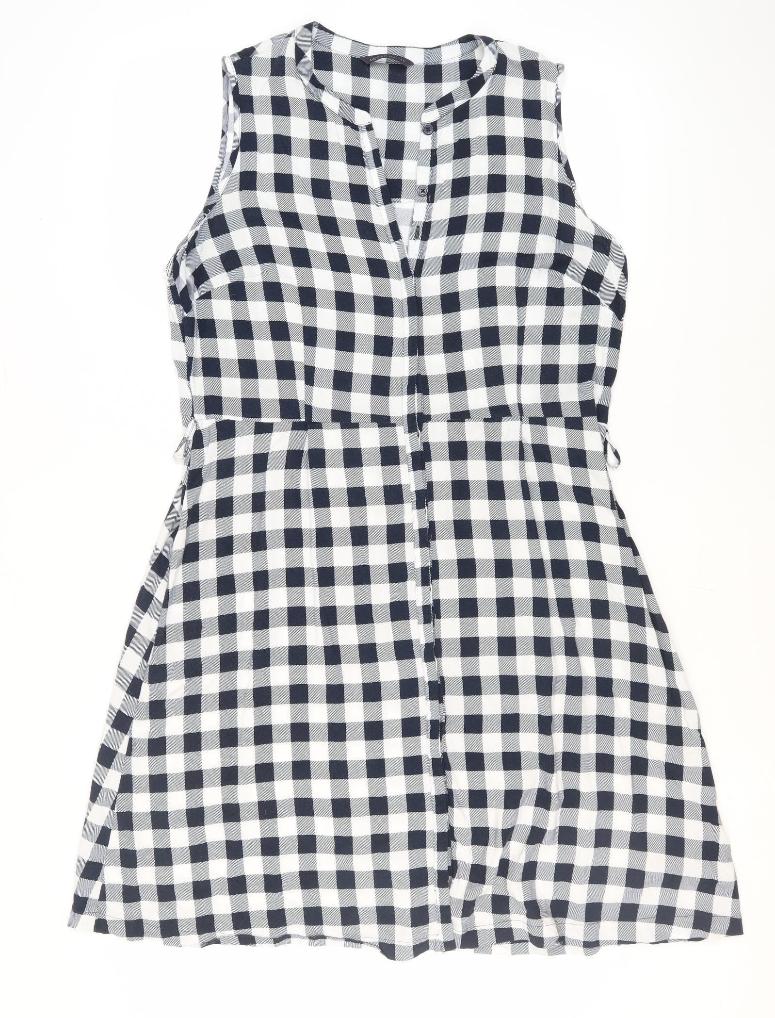 This stylish Marks and Spencer women's shirt dress features a charming gingham pattern in a versatile and contemporary multicoloured design, perfect for casual outings and everyday wear. With a size 16 fit and a regular size type, the dress ensures comfort while showcasing a timeless sleeveless style. The dress is crafted from 100% viscose, offering a soft and breathable woven fabric, ideal for the warmer months. Its V-neckline adds a touch of elegance, complemented by a button closure for functional detailing. Accentuating the dress are buttons along the front, enhancing its aesthetic appeal. It's machine washable, making it easy to care for, and is in excellent condition without visible wear or damage. This piece's charm lies in its adjustable features, perfect for tailoring the fit as per your preference. Whether you're heading out for a casual day or a leisurely afternoon, this gingham shirt dress makes a delightful addition to your wardrobe, highlighting style and comfort in equal measure. Ready to elevate your casual look, make this versatile dress part of your essential collection.