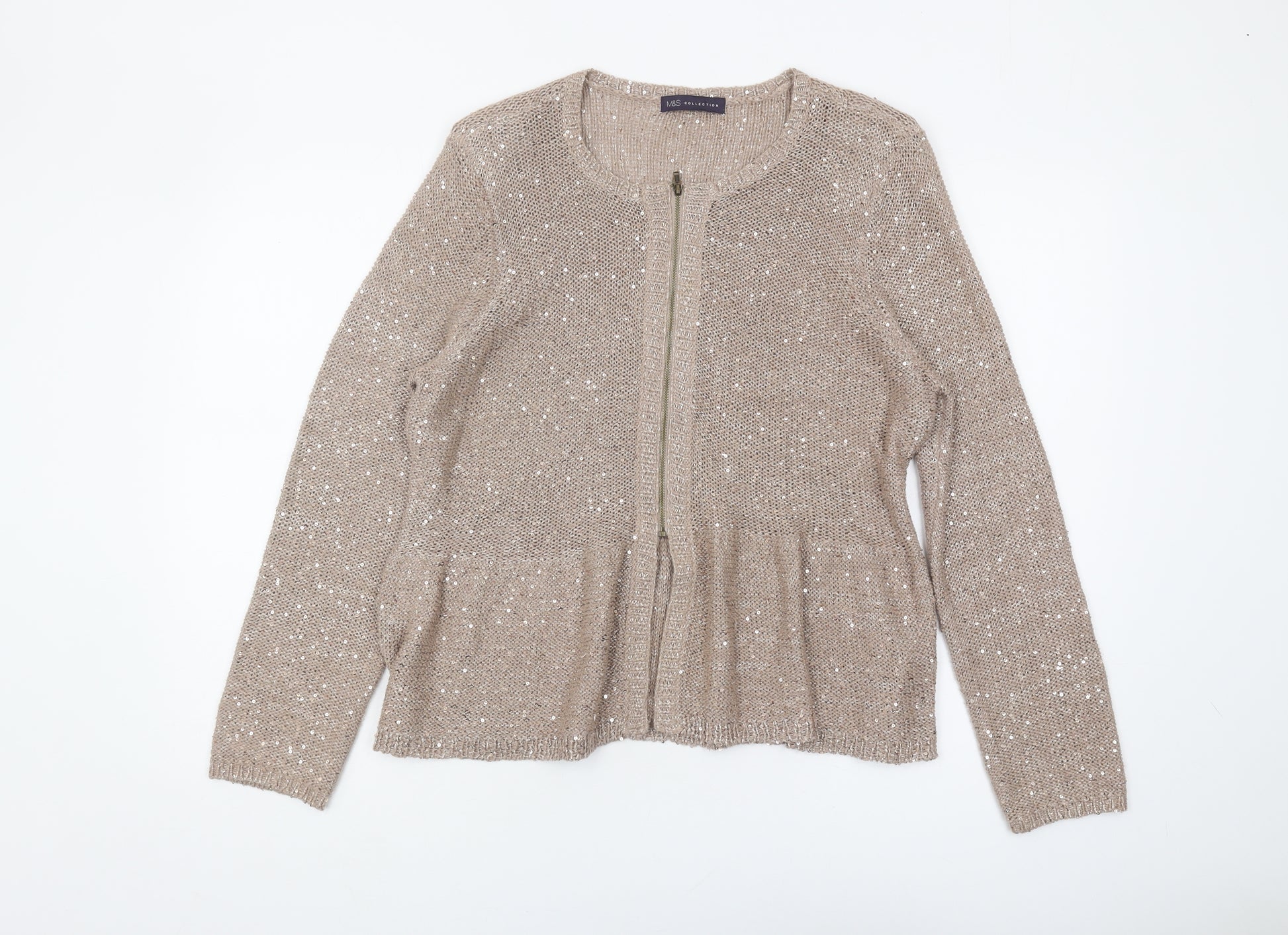 Elevate your wardrobe with this stunning gold cardigan from Marks and Spencer. Crafted with a blend of 52% polyester and 48% cotton, this lightweight knit cardigan is perfect for transitional seasons like autumn, spring, and winter. The open-knit style and round neckline offer a chic, timeless appeal, while the full zip accent adds a touch of modernity. This regular fit cardigan features long sleeves, making it ideal for layering over your favourite tops and dresses. Designed for casual wear, it’s machine washable for convenient care, ensuring you look effortlessly stylish with minimal effort. Available in a flattering size 18, this new with tags cardigan is ready to be a versatile addition to your wardrobe. Perfect for women who love comfort without compromising on style, the shimmering gold hue will add elegance and warmth to any ensemble. Treat yourself to this classic yet contemporary piece and enjoy its versatility for various occasions.
