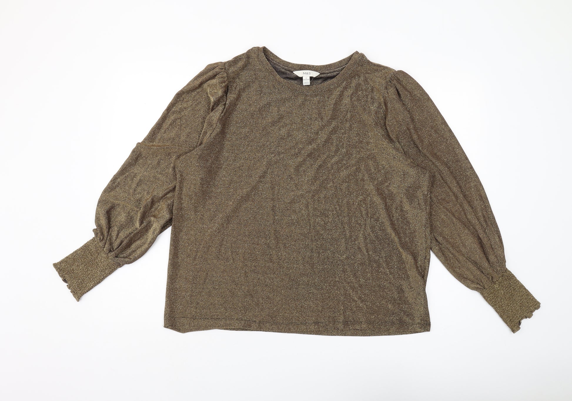 Step into the spotlight with this elegant Marks and Spencer gold blouse, designed for the contemporary woman who values both style and comfort. Crafted from a blend of nylon, polyester, and elastane, this top offers a luxurious feel with a touch of stretch, making it perfect for those casual outings or a day at the office. The classic crew neck is complemented by the stylish puff sleeves, adding a touch of sophistication and charm, effortlessly allowing you to transition from day to night. Its shimmering gold hue is bound to turn heads, while the regular fit ensures that you look chic without compromising on comfort. The blouse is designed for regular sizing, specifically tailored for women who embrace their natural curves. Machine washable, this blouse is low maintenance – perfect for the modern lifestyle. Whether you pair it with jeans for a casual look or a skirt for a more dressed-up vibe, this versatile piece is a wardrobe essential. Despite its excellent condition, it shows no visible defects, symbolising a product that's been well-kept, ensuring longevity in your collection. Available in size 16, this blouse promises to be a flattering addition to your wardrobe, underscoring your individual style and poise. Ideal for casual occasions, it embodies a sense of effortless elegance. Purchase today and redefine your sartorial standards, blending fashion-forward design with timeless appeal.