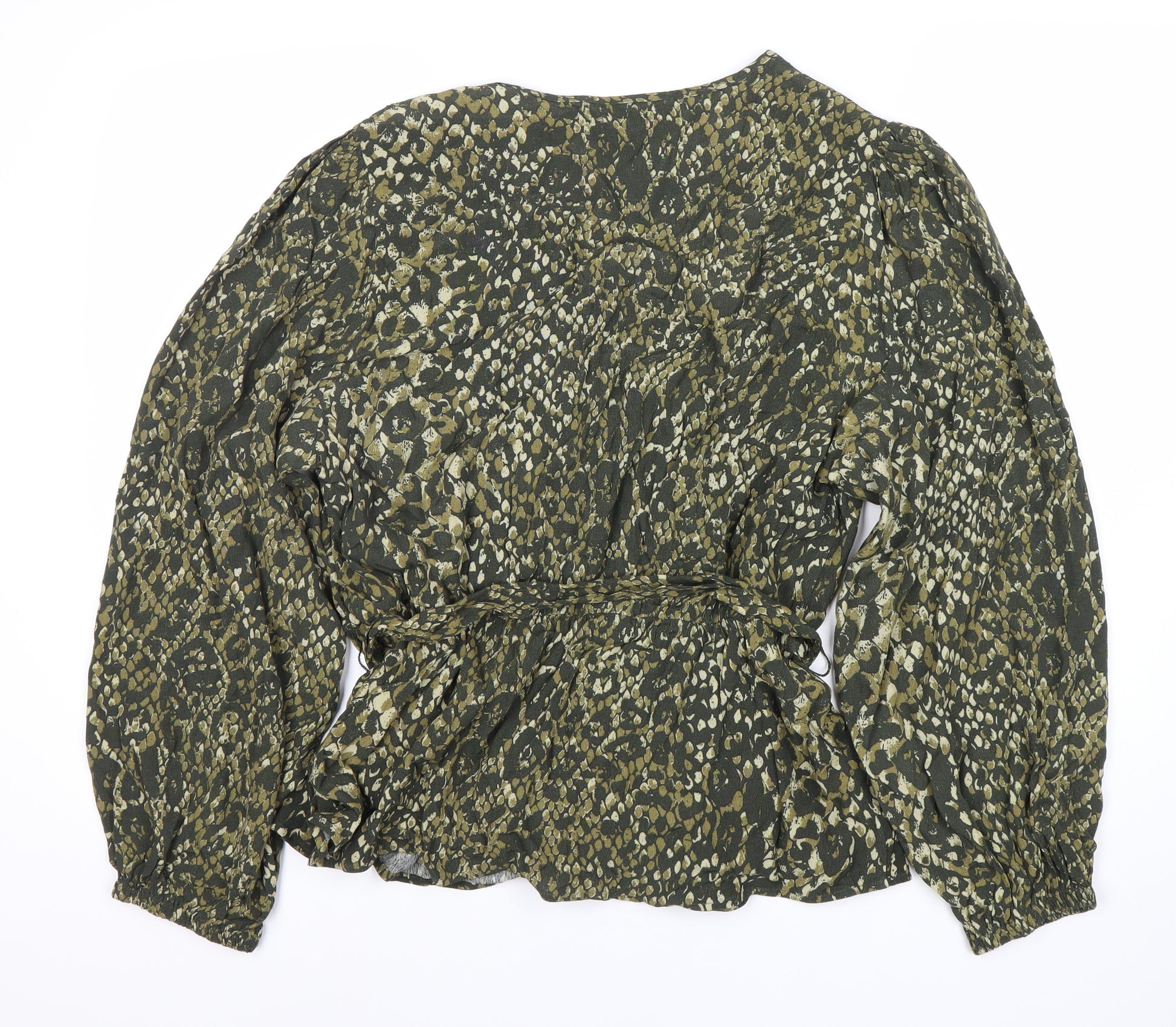 Embrace both elegance and comfort with this exquisite green animal print wrap blouse from Marks and Spencer, tailored for the fashionable woman. Crafted in a flattering size 16, this top combines both style and versatility, making it a splendid addition to your wardrobe. Its sophisticated V-neckline enhances your décolletage beautifully, while the long sleeves provide ample coverage, making it ideal for both autumn and spring outings. The eye-catching animal print makes it a standout piece, adding a hint of wild charm to your attire. Designed as a wrap blouse, the silhouette gracefully accentuates your curves, providing a quintessential fit without compromising on comfort. Tie closure adds a stylish touch, ensuring a customised fit every time you put it on. Crafted from high-quality viscose material, this blouse promises durability along with a luxurious feel. It is machine washable, ensuring easy garment care without the fuss. Whether you're off for a casual day at work or stepping out for a laid-back weekend outing, this blouse fits the bill perfectly. Matching with your preferred pair of jeans or smart trousers, it transitions seamlessly from workplace sophistication to off-duty chic. Elevate your collection with this stunning piece that promises to leave a lasting impression.