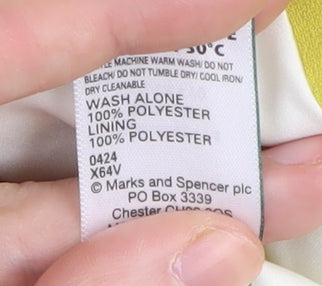 Elevate your wardrobe with this stylish Marks and Spencer women's blazer in a vibrant green hue. Made from high-quality polyester, this single-breasted blazer features a classic notch lapel style, offering a sleek and modern look. Designed for a UK size 14, it's ideal for women looking to make a statement with their fashion choices. The machine washable fabric ensures easy maintenance, while the lack of front buttons enhances its contemporary appeal. Perfect for various occasions, this blazer can be paired effortlessly with both casual and formal ensembles. Although pre-loved, it remains in very good condition with only a minor stain on the sleeve, adding to its character without detracting from its overall charm. An excellent addition to any fashion-forward individual's collection, blending style and practicality seamlessly.
