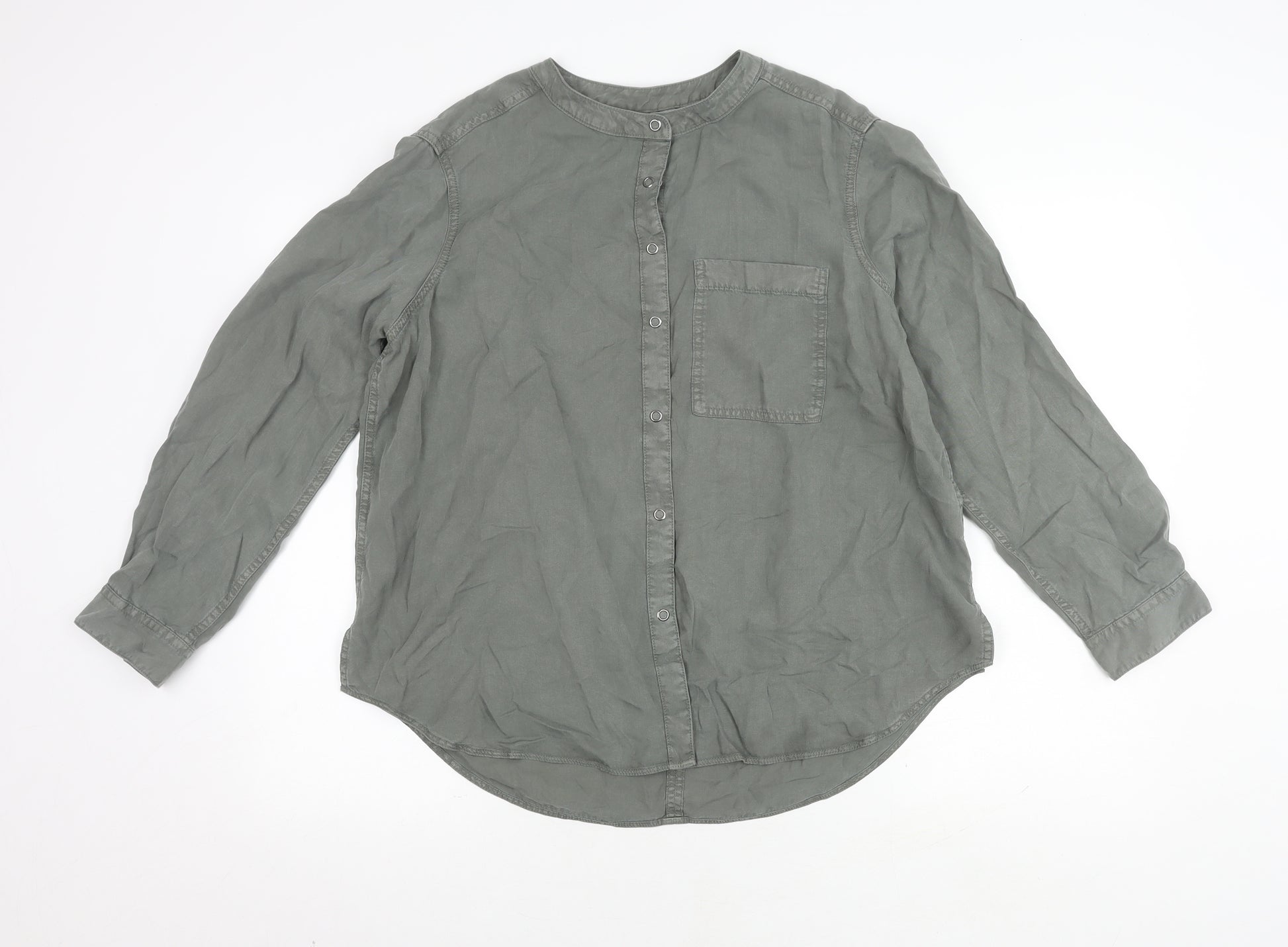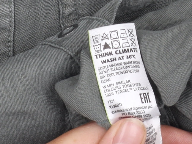 Elevate your wardrobe with this elegant Marks and Spencer Women's Button-Up Shirt, perfect for injecting style and comfort into your everyday look. Crafted from 100% Lyocell, this garment not only offers a luxuriously soft texture but is also an environmentally friendly choice. The rich green hue makes it versatile enough to pair with various styles, adding a touch of class to any outfit.This shirt features a button-up closure, providing an effortless and casual fit that is ideal for a range of occasions, from casual outings to more refined settings. The long sleeves offer additional warmth, making it an adaptable piece for all seasons. A classic crew neck design contributes to its timeless appeal.Designed with the modern woman in mind, this shirt ensures a regular fit that flatters all body types. Though in excellent condition, it carries a slightly wrinkled appearance which can easily be ironed out, maintaining its pristine quality and charm.Machine washable, this garment is easy to care for, ensuring it remains a staple in your wardrobe for years to come. Its solid pattern and classic/fitted sleeve type make it an immaculate addition to any fashion-forward ensemble.Whether dressing for business or leisure, this Marks and Spencer Button-Up Shirt in green is a testament to quality and style, fitting seamlessly into any fashion-conscious woman's clothing collection.