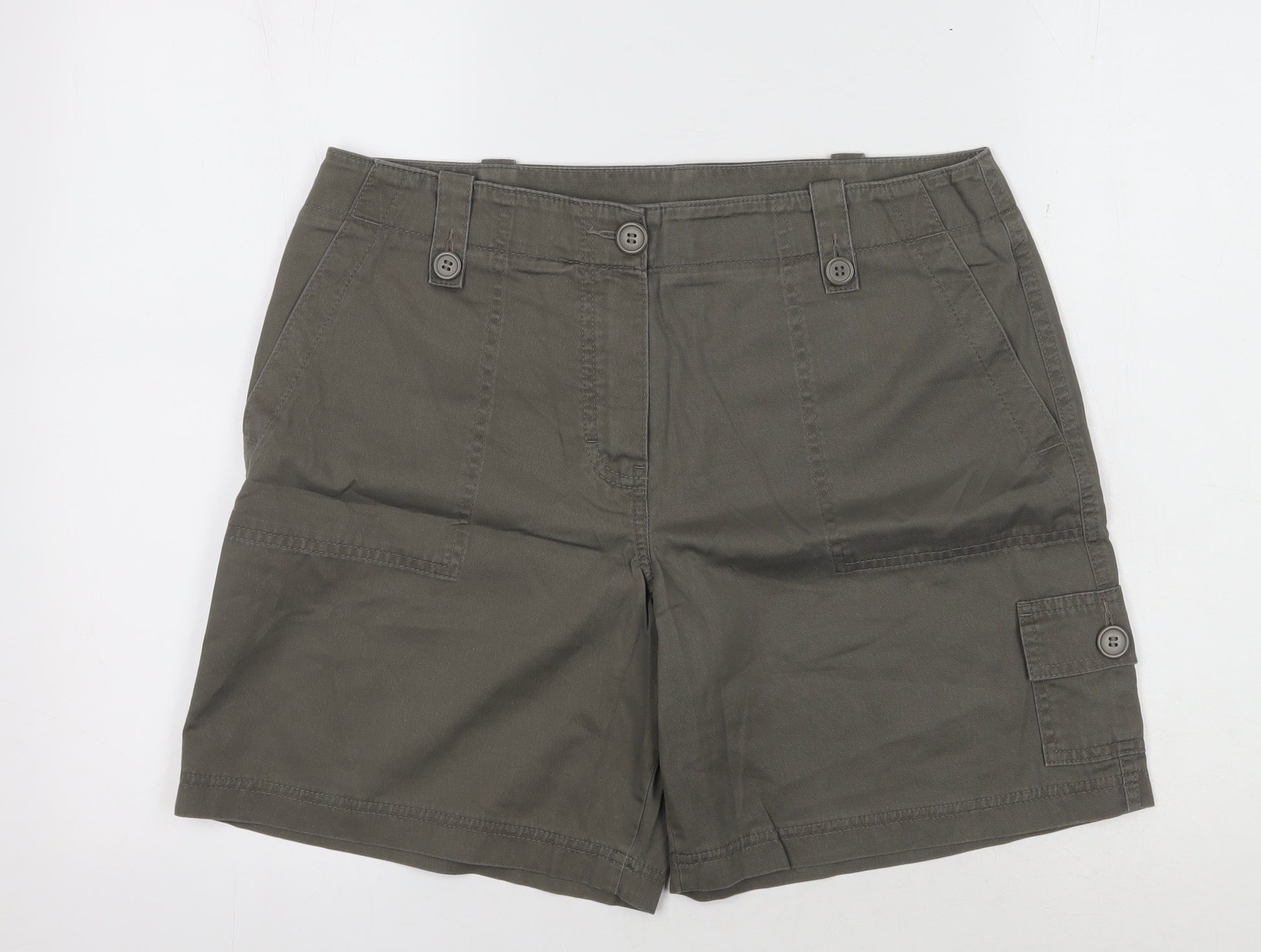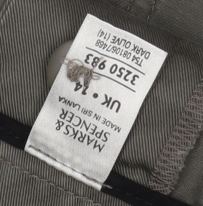 These Marks and Spencer cargo shorts in a stylish olive green are crafted from 100% cotton, ensuring comfort and breathability throughout the spring and summer seasons. Designed for the modern woman, these shorts feature a casual style with a flat front and a reliable button closure. The regular fit and mid-rise design provide a comfortable and flattering silhouette, making them suitable for various casual occasions. The standout feature of these cargo shorts is the practical button accents and cargo pocket design, providing ample room for essentials. Whether you're strolling through the park or enjoying a picnic, these shorts offer both style and convenience. With a dark fabric wash, they pair effortlessly with a variety of tops and accessories, allowing for endless styling possibilities. Machine washable for easy care, these shorts are an excellent addition to any summer wardrobe. Despite showing light wear, they remain in excellent condition with no visible damage, offering a durable and fashionable choice at an affordable price.