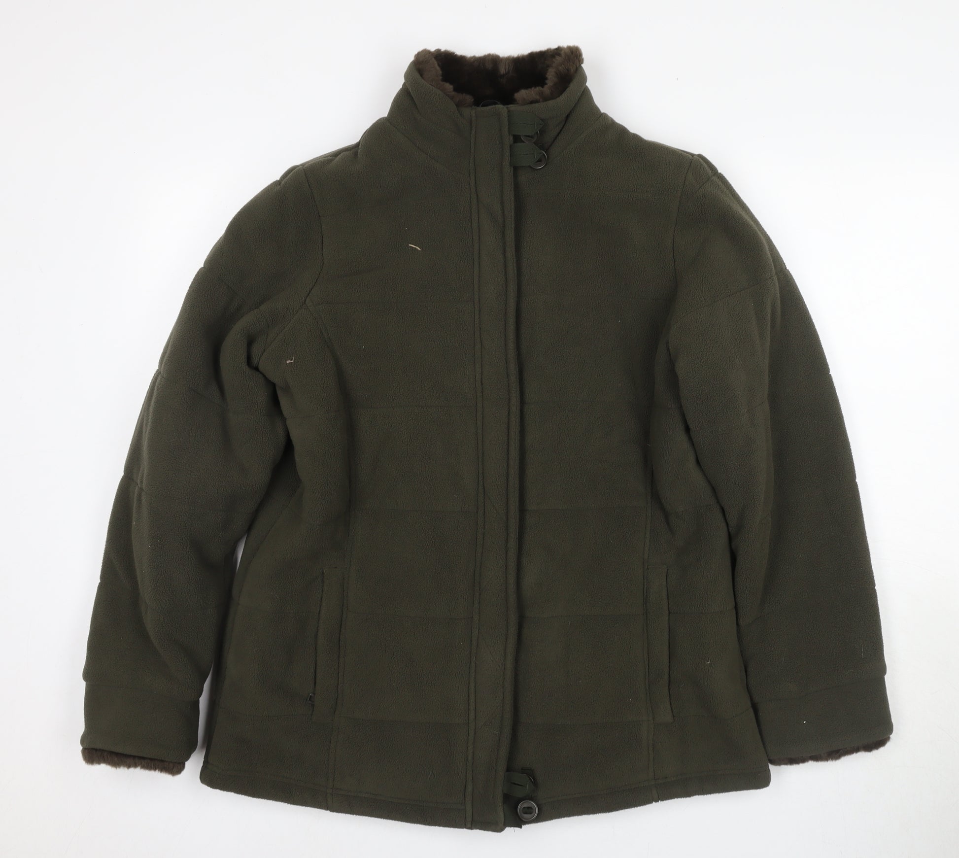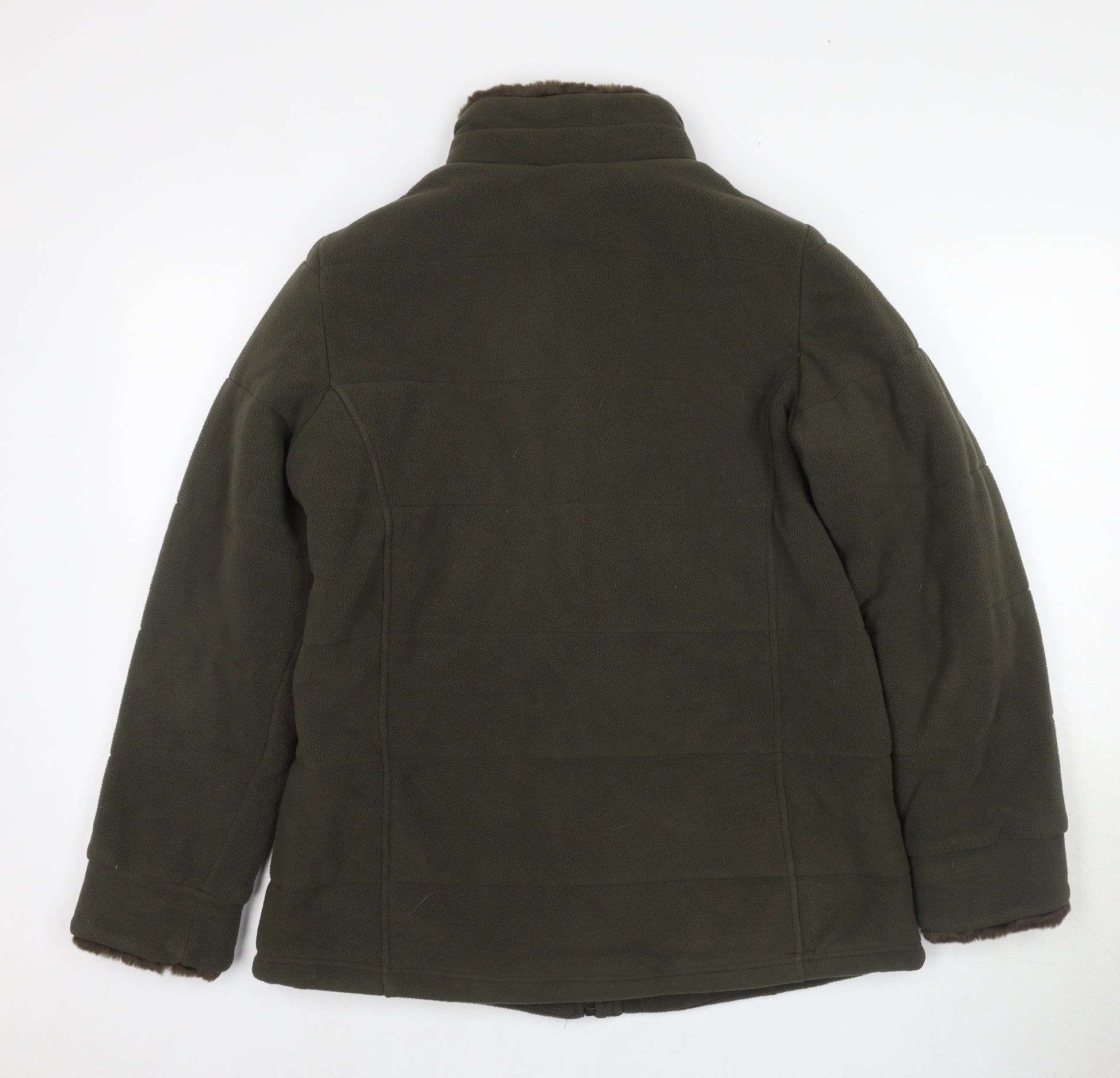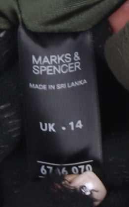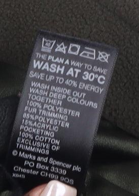 Wrap up warm and stylish this autumn and winter with this enchanting green fleece jacket by Marks and Spencer, perfect for the fashion-forward woman. In a pristine size 14, this mid-length jacket offers a regular fit that is ideal for layering over casual wear. Crafted from 100% polyester, the jacket ensures warmth and comfort during colder months, with a soft fleece fabric that feels luxuriously cozy. Designed in a basic yet versatile style, the jacket features convenient zipped pockets allowing you to safely store your essentials. The secure zip closure is complemented by button accents for an added touch of elegance. Made with women's needs in mind, its long sleeves provide comprehensive coverage against chilly drafts. With its thoughtful design and quality material, this jacket is machine washable, making care simple and hassle-free. Whether you're heading for a casual day out or a brisk walk, this jacket's regular fit and stylish look will enhance your ensemble. The timeless green hue blends easily into any wardrobe, offering versatility and trendiness. Buy now to enjoy a perfect blend of comfort, utility, and classic elegance.