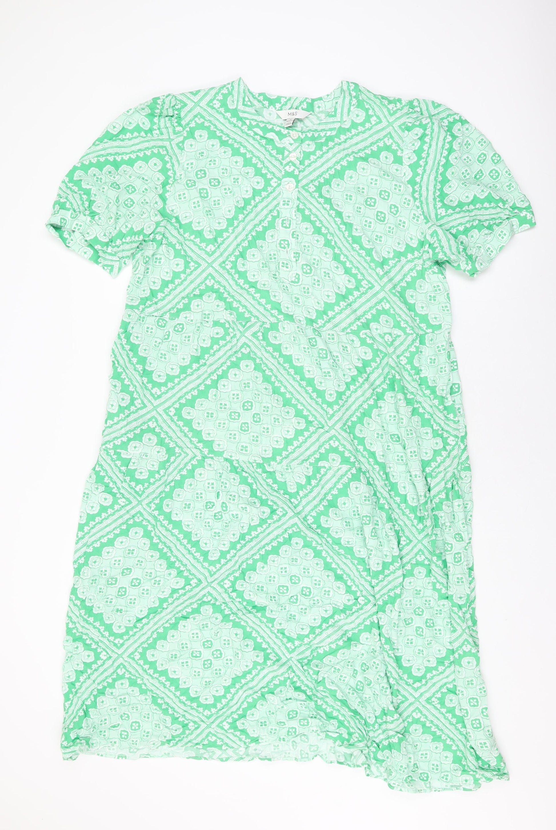 Womens Green Geometric Viscose A-Line Size 18 Round Neck Button