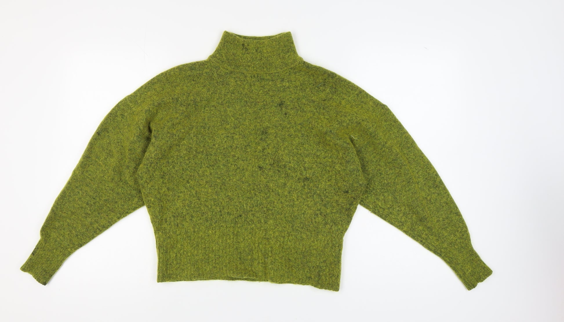 Discover warmth and style with this Marks and Spencer women's high neck jumper in an inviting green hue. Crafted primarily from a blend of wool, mohair, and polyamide, it ensures both comfort and durability. This heavyweight knit is perfectly suited for those chilly winter days, making it an essential addition to your seasonal wardrobe. Despite being in excellent condition, minor wear is visible, adding a touch of character to the piece. It is machine washable, allowing for easy care. Dive into the knitted elegance that's perfect for casual outings or staying cozy indoors.