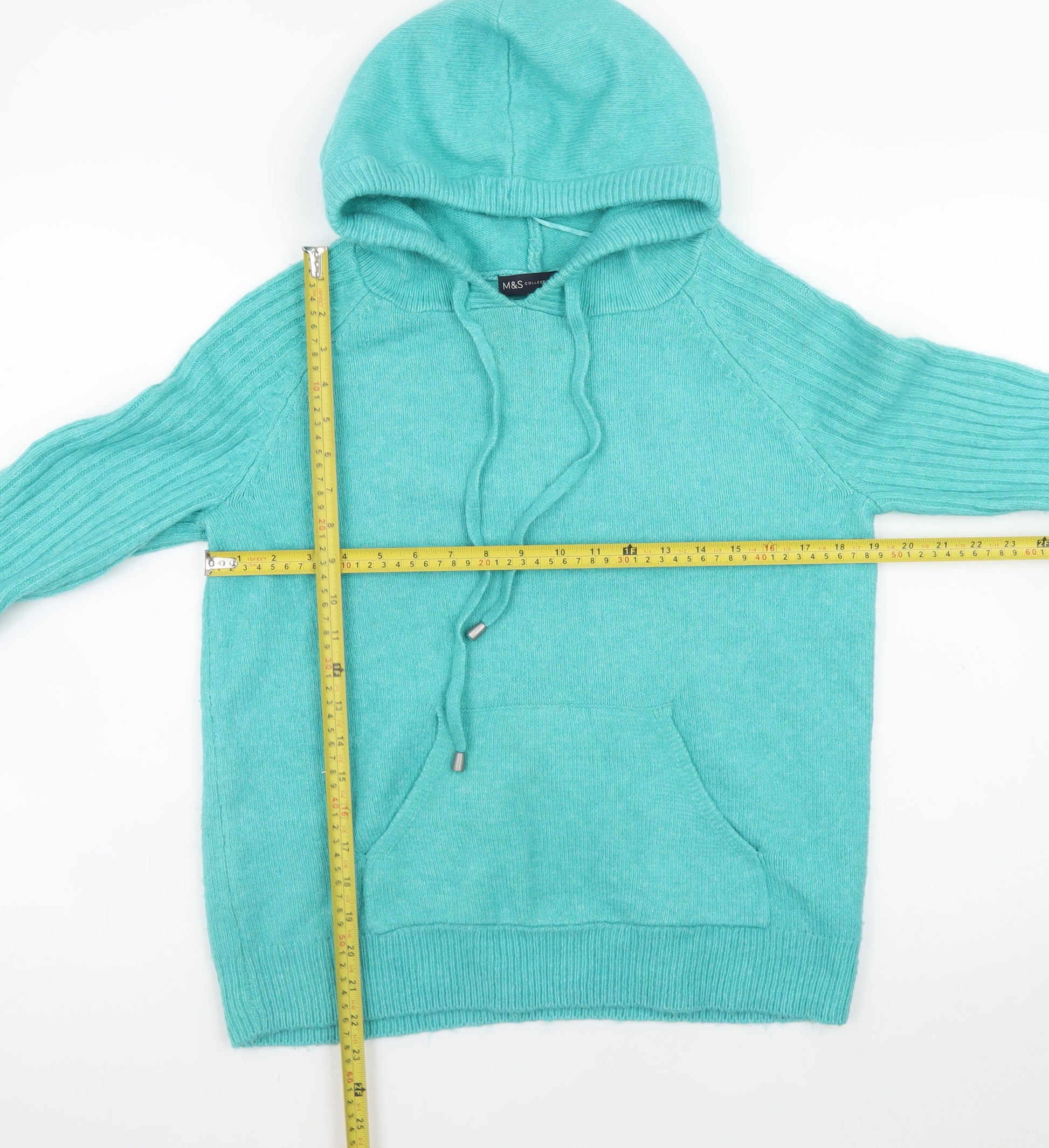 This Marks and Spencer women's hooded jumper in a refreshing green shade offers a perfect blend of cosy comfort and effortless style. Crafted from a soft knit fabric made with a blend of 68% acrylic, 30% polyester, and 2% elastane, it feels lightweight yet warm — ideal for layering in cooler months or wearing alone during milder days. The classic pullover design features a comfortable hood with drawstring detail, ribbed long sleeves with raglan shaping for improved movement, and a snug ribbed hem and cuffs that lend both structure and style. Designed for a relaxed, regular fit, this jumper delivers everyday charm while remaining versatile enough to pair effortlessly with your casual wardrobe favourites, from jeans to leggings. The tight-knit texture helps maintain shape while offering a smooth silhouette, making it a great choice for laid-back weekends or on-the-go comfort. As part of Marks and Spencer’s trusted collection, this jumper combines quality construction with timeless appeal, ensuring it remains a go-to favourite season after season. With its cheerful colour and easy-care machine washable design, it’s practical as well as fashionable. Perfect for autumn and winter wear, the piece brings a warm yet breathable feel to your outfit, proving that casual style can be both simple and sophisticated. Gently used in excellent condition with no visible marks or damage, this lovely jumper looks well cared for and ready to wear. Add a touch of effortless chic to your collection with this beautiful Marks and Spencer knit — a perfect blend of comfort, durability, and understated elegance.