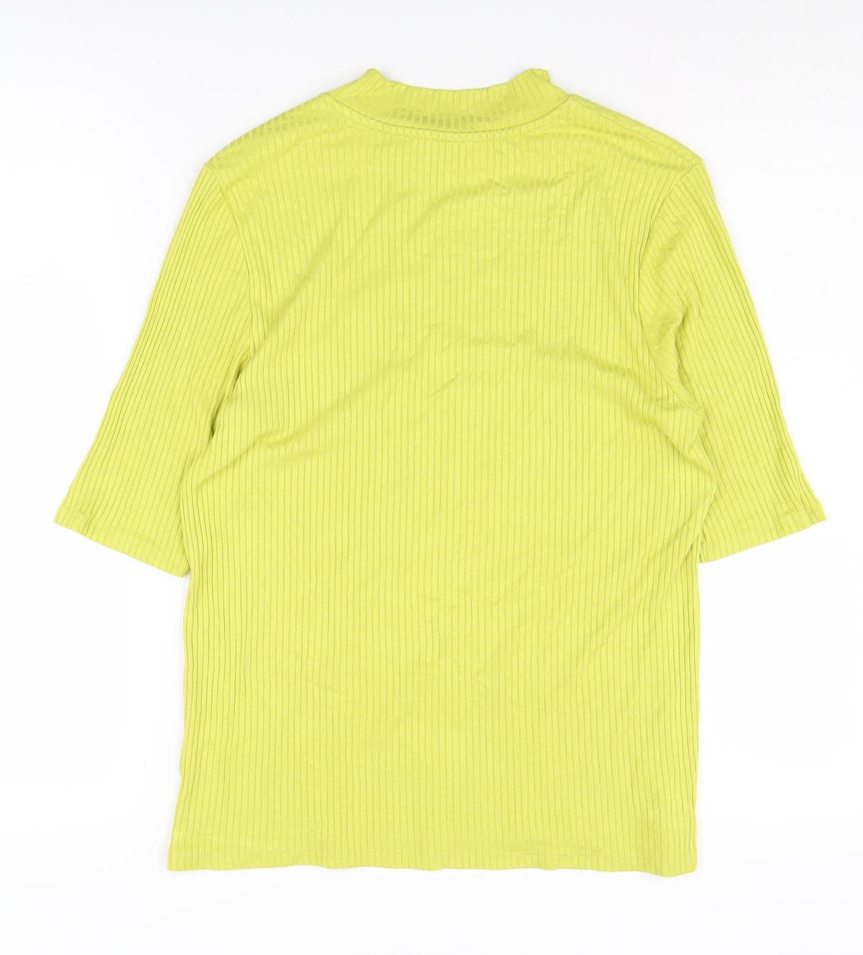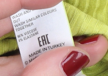 Elevate your casual wardrobe with this Marks and Spencer Women's Green Mock Neck Top, designed with a flattering regular fit. Crafted from a soft jersey fabric, this versatile piece combines 96% Viscose and 4% Elastane to offer a comfortable stretch and breathable wear. Its solid green hue and basic style make it a perfect choice for laid-back summer outings. The mock neck and classic fitted 3/4 sleeves add a touch of elegance, while the pullover closure ensures easy dressing. Pair it with jeans or skirts for a relaxed yet polished look. Condition is excellent with only minor creases. Machine washable for convenience, it's an easy addition to any collection.