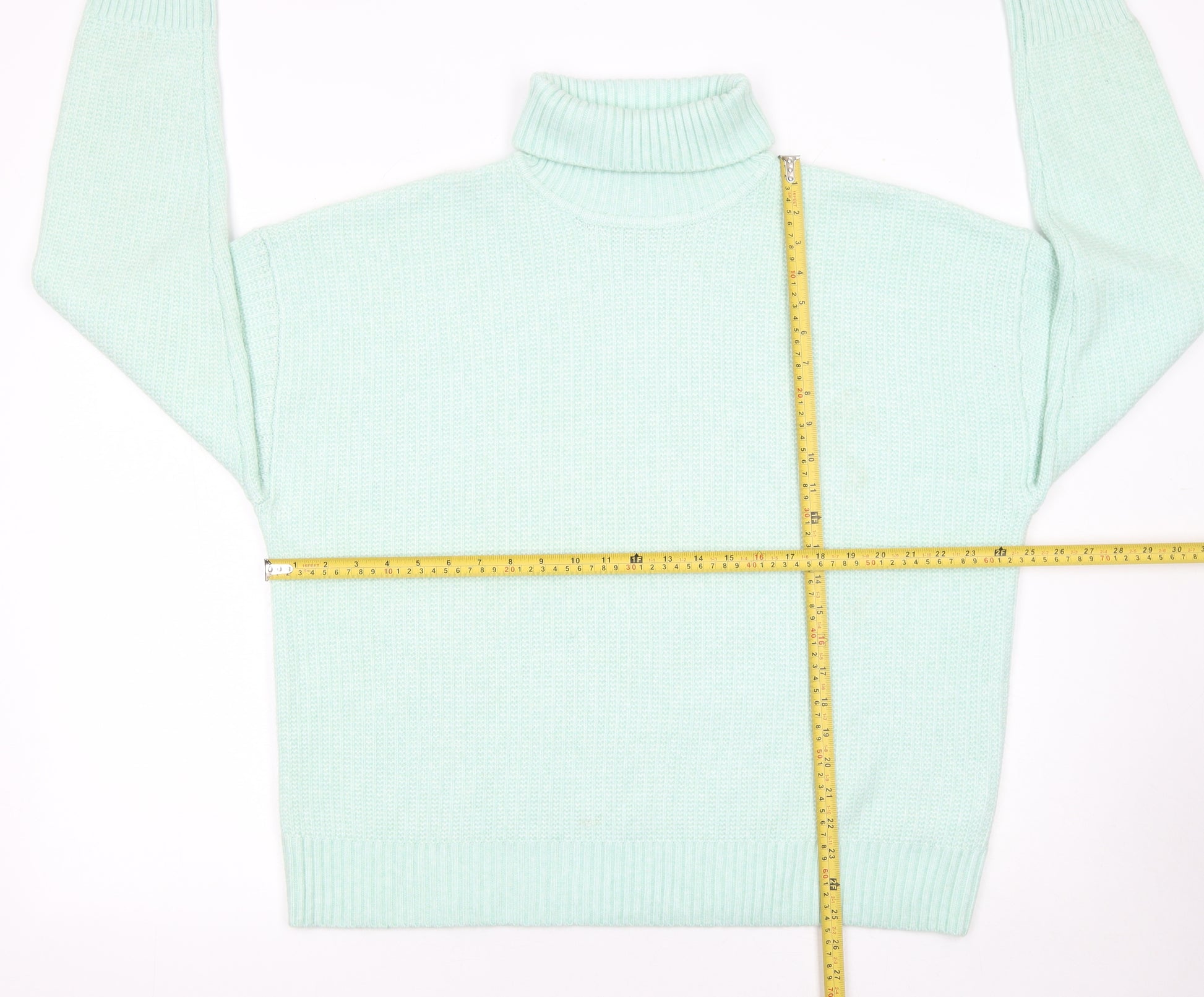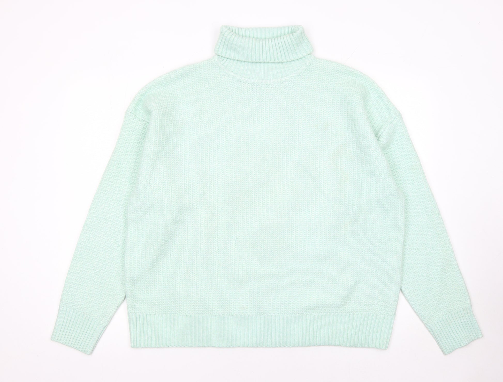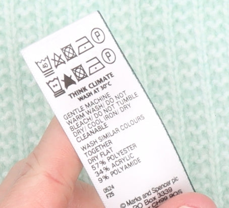 This Marks and Spencer women’s jumper is a stylish wardrobe essential designed for comfort and understated sophistication. Crafted from a quality blend of polyester, acrylic, and polyamide, it offers a soft and cosy feel without being heavy, making it ideal for transitional weather wear. The light mint-green shade adds a refreshing pop of colour that complements any outfit, while the roll neck gently frames the neckline and adds an extra layer of warmth for chilly days. The long sleeves and ribbed cuffs provide a snug fit that helps retain shape and ensures lasting durability. Its tight-knit texture enhances both comfort and structure, giving it a clean, minimal finish suitable for everyday wear. The regular fit allows easy layering over shirts or under coats, making it versatile enough for casual outings, workdays, or relaxed weekends. This jumper pairs effortlessly with jeans or tailored trousers, offering effortless style with minimal effort. Designed by Marks and Spencer, it reflects the brand’s commitment to quality craftsmanship and timeless style. Machine washable for practicality, this piece fits seamlessly into modern wardrobes that balance style with convenience. Its well-made construction and reliable fabric make it both a comfortable and cost-effective choice for women seeking an elevated yet comfortable knitwear option. Whether worn tucked into a skirt for a chic office look or layered over leggings for a cosy weekend ensemble, this roll neck jumper adds polish and poise to any occasion. Tailored with subtle finishing details such as ribbed hems and cuffs, the silhouette flatters without clinging, ensuring it drapes naturally. This garment is in excellent pre-loved condition with minimal signs of wear. Perfect for autumn and winter, it’s a versatile addition that provides warmth and comfort season after season. Refresh your collection with this effortlessly stylish Marks and Spencer knit and enjoy a perfect balance of modern design and enduring comfort.