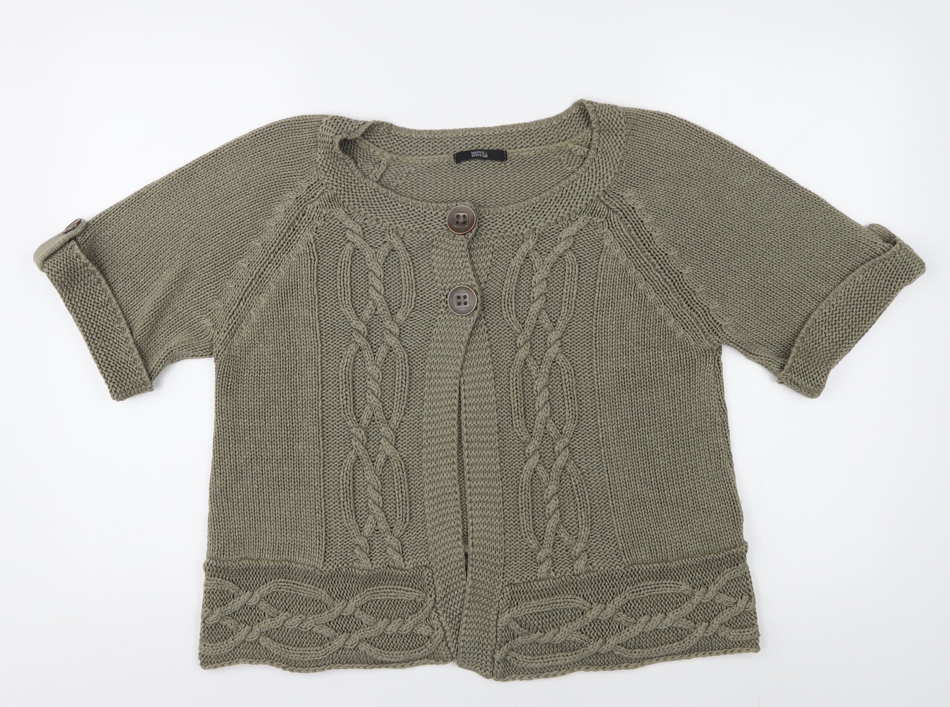 Discover style and comfort with this Marks and Spencer women's cardigan, perfect for versatile wear throughout the year. Crafted from 100% cotton, this cardigan offers a luxurious feel and breathability, keeping you cosy in any season. The elegant cable-knit design adds a touch of sophistication, while the short raglan sleeves provide a relaxed and comfortable fit, ideal for casual occasions. The round neck complements its button accents, making it easy to layer over your favourite tops. The fresh green hue adds a pop of colour to your wardrobe, effortlessly matching a variety of outfits. Designed in a regular fit with machine-washable fabric, this cardigan is both stylish and practical for everyday wear. Elevate your casual attire with this timeless piece, sure to become a staple in your fashion collection.
