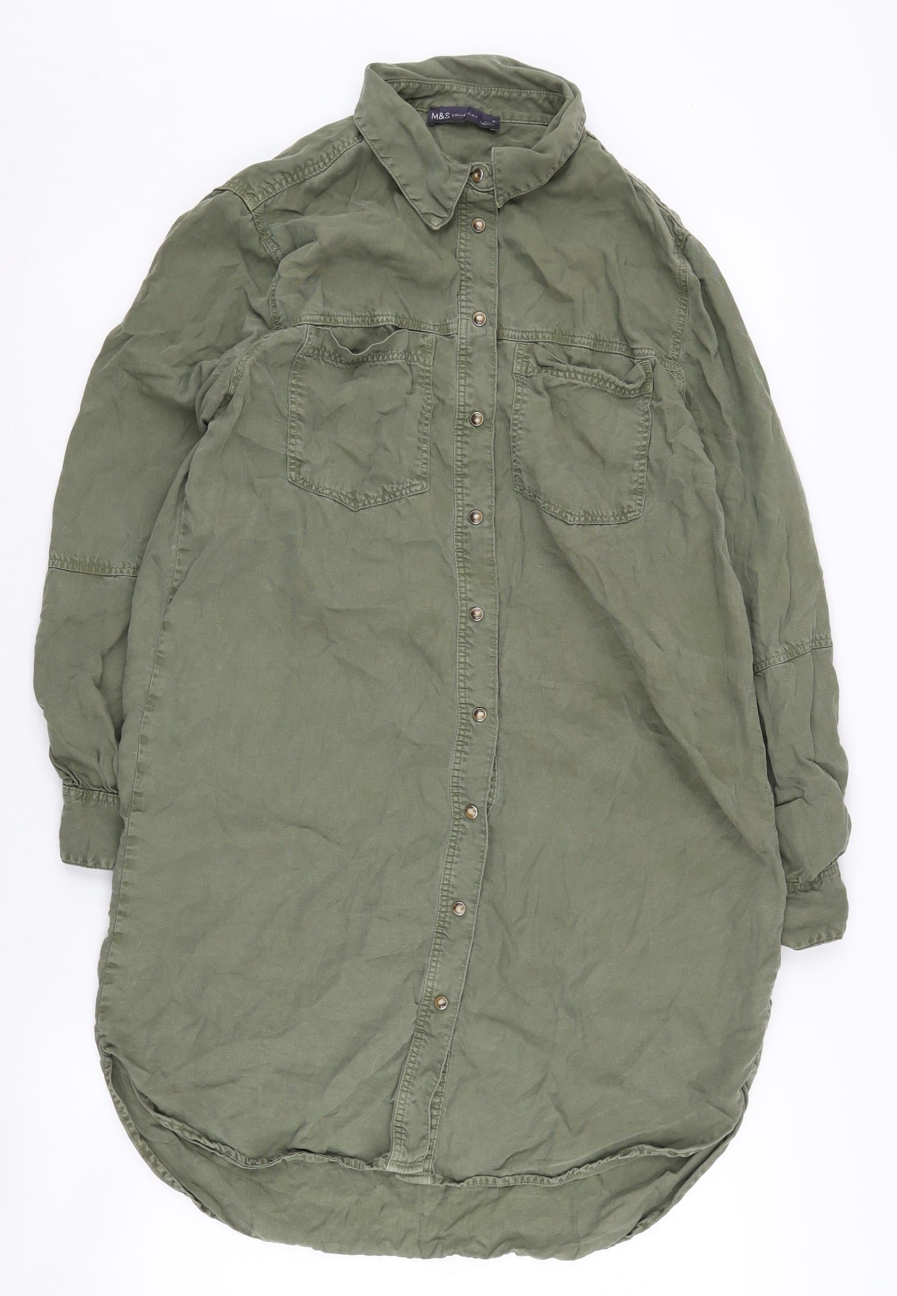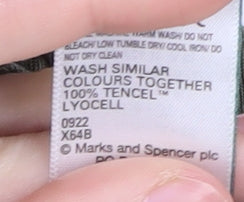 Add a touch of classic elegance to your wardrobe with this stylish button-up shirt from Marks and Spencer. Crafted from 100% Lyocell, it promises a soft, comfortable feel that drapes beautifully for a flattering fit. Designed in a sophisticated shade of green, this shirt is perfect for any woman seeking a versatile addition to her wardrobe. Featuring a collared neckline and classic long sleeves, it’s ideal for both casual and more formal occasions. The regular fit ensures comfort and a relaxed silhouette, making it a must-have piece for any season. With a solid pattern and a button closure, this shirt offers timeless charm. Although previously worn, it’s in excellent condition, exhibiting only minor wrinkling in the fabric, which adds to its casual appeal. Pair it with your favourite jeans for a laid-back look or dress it up with a pencil skirt for the office. Easy to care for, it's machine washable, making it a practical as well as stylish choice. Don’t miss the chance to add this fashionable and functional shirt to your collection.