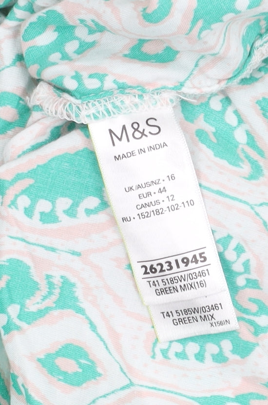 Elevate your seasonal wardrobe with this charming Marks and Spencer blouse, perfectly crafted for comfort and style. This women's green tunic blouse features a delicate geometric pattern that adds a touch of elegance to any outfit. With a relaxed fit, this blouse is designed with 3/4 balloon sleeves, providing airy comfort and a fashionable silhouette. Crafted from 100% cotton, it offers a breathable and easy-care fabric, perfect for spring and summer occasions. The blouse is adorned with buttons, enhancing its casual yet sophisticated charm. Ideal for casual outings or leisurely days, its versatile design pairs effortlessly with jeans or skirts. Enjoy the balanced mix of comfort and style in this delightful tunic, perfect for creating a variety of fashion-forward looks. Trust Marks and Spencer for quality and finesse in every detail.