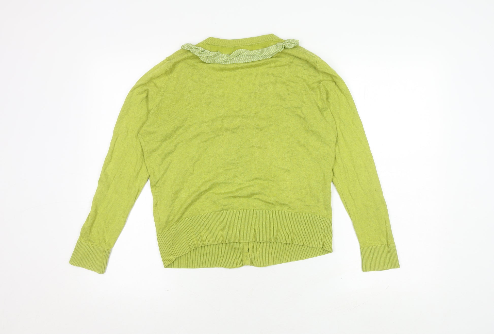 This delightful green cardigan from Marks and Spencer offers both style and comfort, making it a perfect addition to your wardrobe. Made from a soft blend of cotton, polyester, and viscose, it is lightweight and machine washable, ensuring ease of care. The V-neck design and button accents provide a classic look, while the charming ruffled trim adds a touch of femininity. Suitable for casual outings or adding a pop of colour to your everyday wear, this long sleeve cardigan is perfect for both spring and autumn. Offered in a regular size 14, it ensures a comfortable fit. While the cardigan is in excellent condition, with no visible signs of wear or damage, please note it falls under the 'used' category, allowing you to enjoy quality fashion at an affordable price.