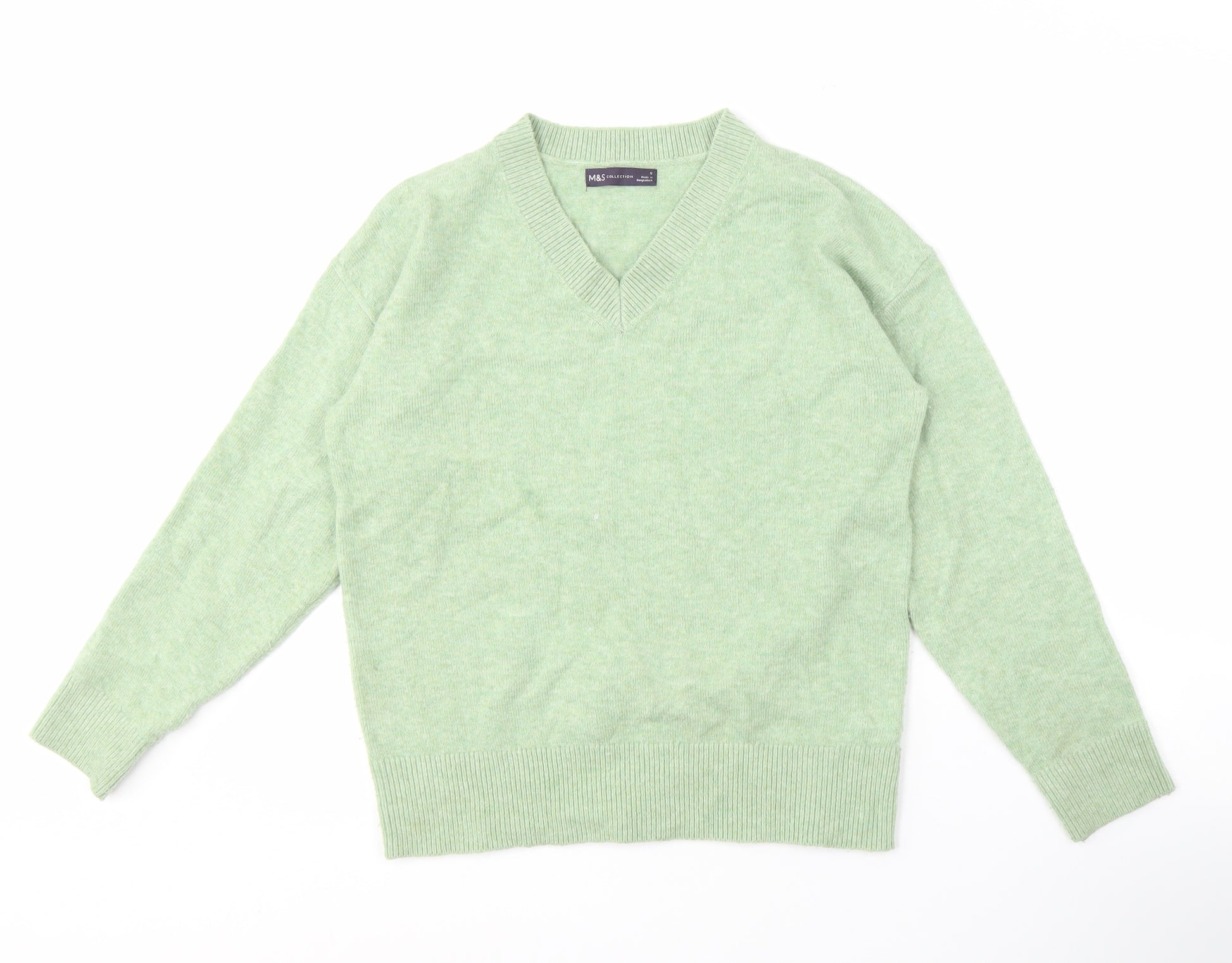 This stylish green V-neck jumper from Marks and Spencer is an essential addition to any wardrobe. Designed for women, it offers a comfortable regular fit that is perfect for everyday casual wear. The soft knit fabric consists of a blend of polyester, acrylic, wool, and elastane, ensuring both warmth and flexibility. Enjoy the luxurious feel of the long sleeves and enjoy the versatility of this piece in all seasons. With its clean lines and no-pattern design, it fits seamlessly into any outfit. Machine washable and easy to care for, this pullover is both practical and fashionable. An excellent condition item, with no visible defects, it's ideal for style-conscious individuals looking for a quality item at a great price.
