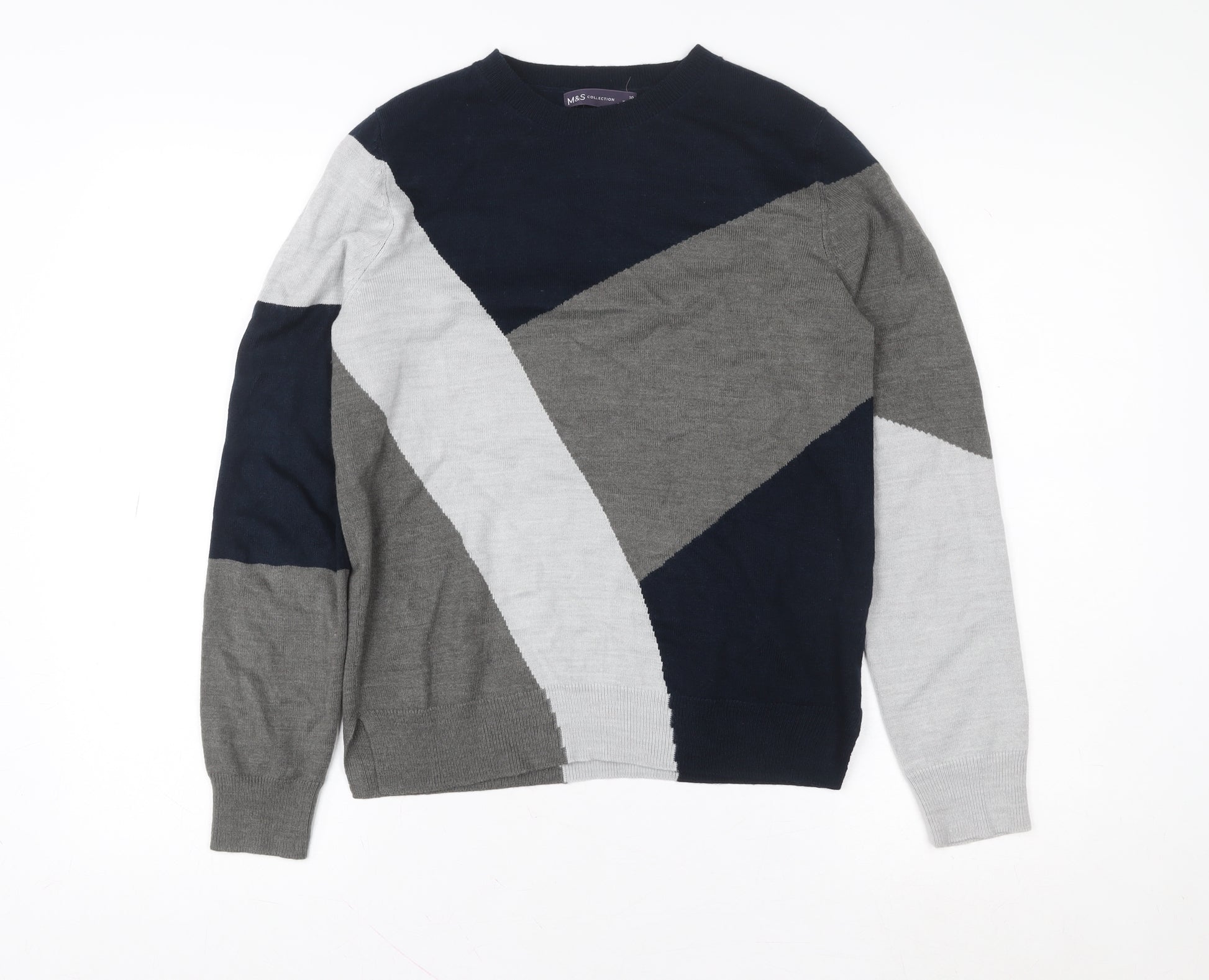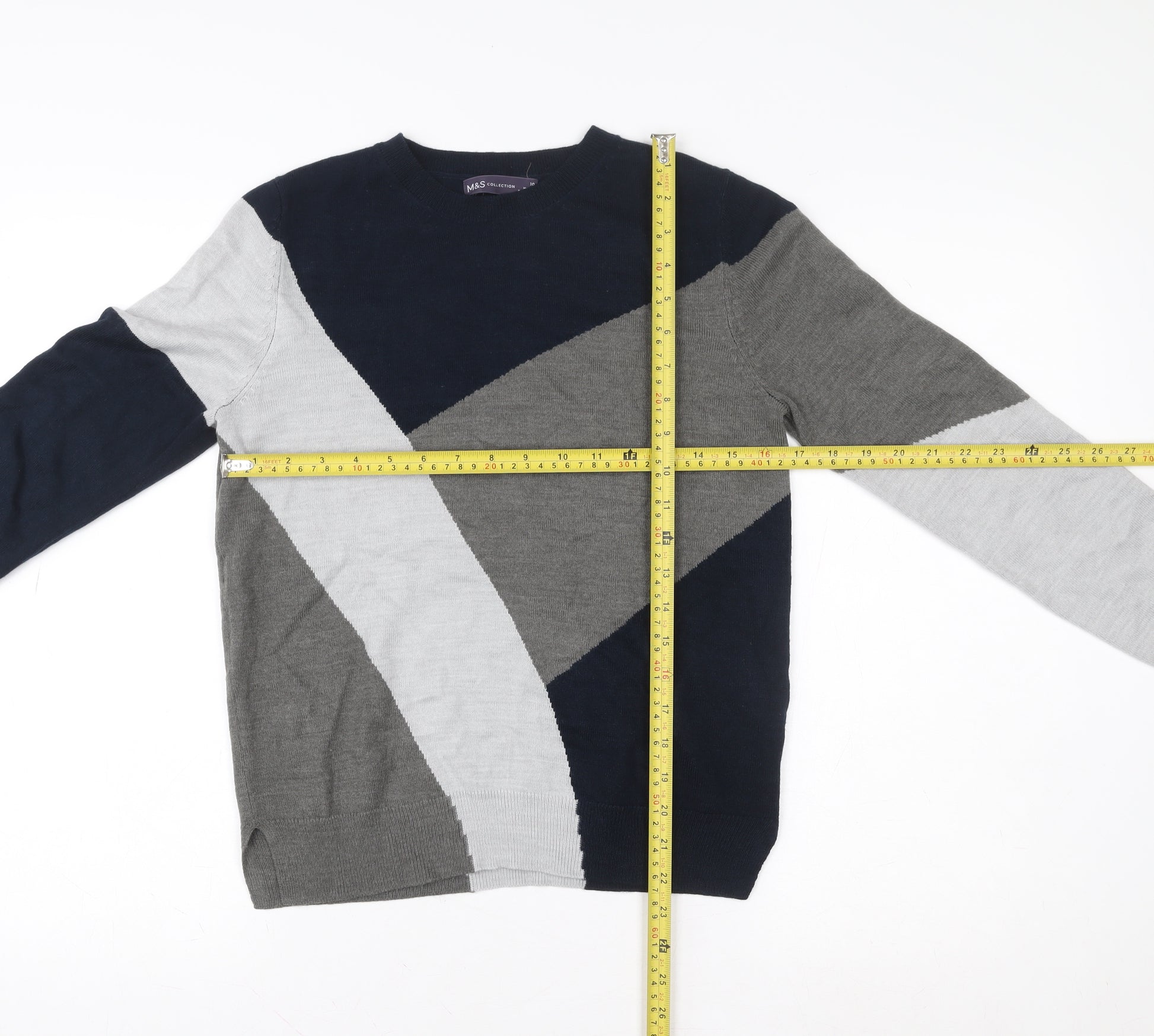 Elevate your casual wardrobe with this stylish Marks and Spencer Collection women's pullover, designed in a modern geometric colourblock pattern featuring shades of grey, navy, and light grey. Crafted with attention to detail, this jumper brings together striking design and comfortable wearability. The crew neck provides a classic silhouette suitable for layering or wearing on its own, while the full-length sleeves add warmth for cooler seasons. Designed in a regular fit, it offers both comfort and versatility—perfect for casual outings, workdays, or weekend relaxation. Made from a soft knitted fabric, this piece feels gentle on the skin and retains its shape after washing, reflecting the trusted quality that Marks and Spencer is known for. The high-quality craftsmanship ensures this jumper remains a wardrobe favourite for years to come. The subtle ribbing on the hem, cuffs, and neckline enhances durability and fit, while the easy-care material ensures low-maintenance upkeep. Pair this jumper effortlessly with jeans, leggings, or skirts for a variety of looks that suit every occasion. Whether layered over a shirt for a polished appearance or styled casually with your favourite denim, it’s a versatile piece offering timeless appeal. Ideal for autumn and winter seasons, this geometric pullover balances contemporary flair with everyday comfort, making it a go-to option for the fashion-conscious woman. The neutral tones ensure it coordinates easily with a wide range of outfits, while the abstract pattern introduces a subtle modern twist. A perfect addition to any wardrobe that values stylish simplicity and dependable wear.