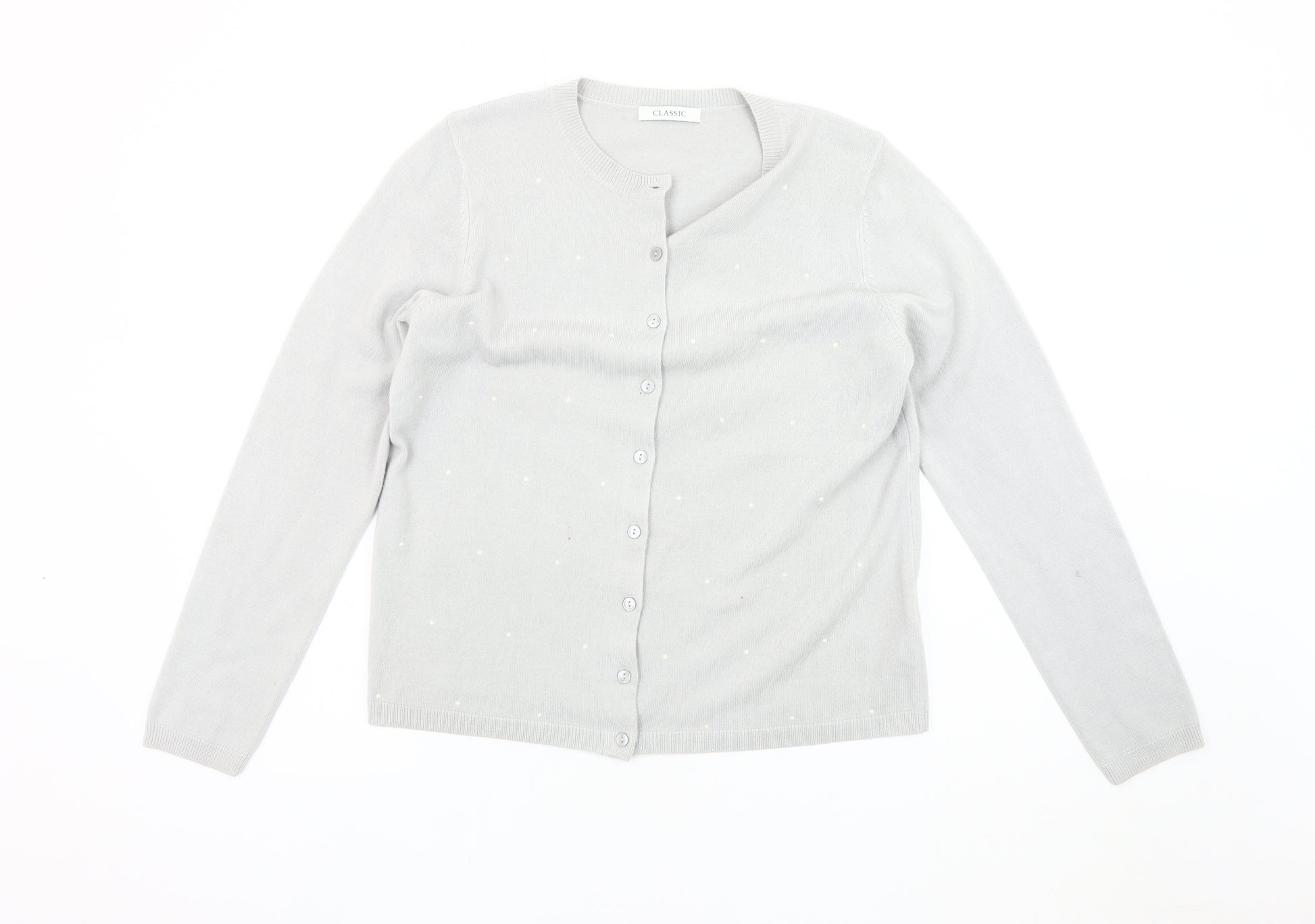Elevate your wardrobe with this elegant Marks and Spencer women's cardigan in a versatile grey tone. Designed with a classic crew neck and long sleeves, this cardigan offers a timeless silhouette that’s perfect for autumn, spring, and winter wear. Made from 100% acrylic, the cardigan ensures warmth and comfort while being easy to care for with a machine washable feature. Its tight-knit style offers durability, making it a reliable piece for everyday casual wear. The button accents enhance its classic look, making it suitable for multiple occasions. As a regular fit, it caters to a size 12, providing comfort and style. Whether pairing it with jeans for a relaxed day out or layering over a blouse for a more polished appearance, this cardigan promises versatility. New with tags and ready to become a staple in your wardrobe, this piece guarantees exceptional quality and enduring style. Don't miss out on adding this essential cardigan to your collection!