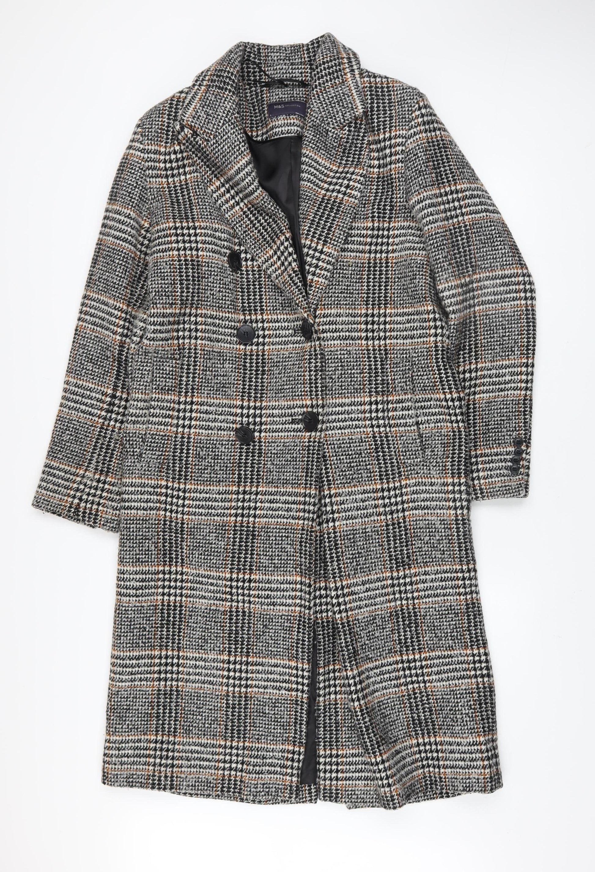Discover timeless sophistication with this Marks and Spencer women's grey check long coat, crafted from a luxurious wool blend for effortless warmth and style. Perfect for autumn and winter, this classic overcoat features a double-breasted button front with a tailored collar that exudes elegance for both business and casual settings. The grey tweed-style check pattern is beautifully accented with subtle tones, giving the coat a versatile appeal that complements both formal office wear and smart weekend ensembles. Expertly lined in smooth polyester for comfort, this coat is designed to keep you warm while maintaining a refined silhouette. Practical details include long sleeves, functional pockets, and a structured regular fit designed to flatter without restricting movement. The high-quality wool blend fabric delivers durability, ensuring this coat remains a wardrobe favourite season after season. In excellent pre-owned condition, this Marks and Spencer piece shows minimal signs of wear, maintaining its original structure and texture. With its polished finish and contemporary check design, this coat represents the perfect balance of function and style. Ideal for pairing with tailored trousers, boots, or your favourite dress, it’s a versatile outerwear staple for workwear, business meetings, or everyday adventures. The grey and black pattern makes it easy to layer over neutrals or add contrast to vibrant outfit combinations. Functional and fashionable, this longline coat is the ultimate layering essential for the modern woman who values both comfort and sophistication. Add this beautiful wool blend check coat to your wardrobe today and elevate your seasonal style with effortless British charm from Marks and Spencer.