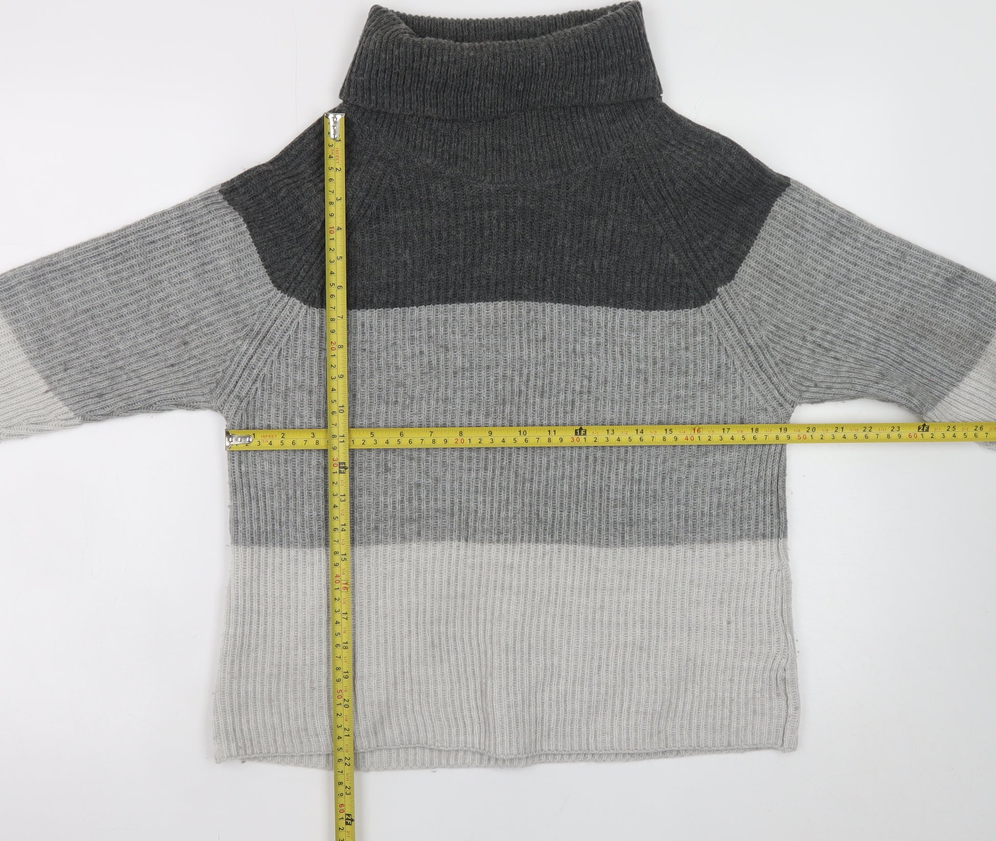 Stay cosy and elegant in this timeless Marks and Spencer women’s roll neck jumper, crafted in a chic trio of grey tones. The comfortable pullover design is perfect for adding a touch of sophistication to your casual wardrobe. Cut in a relaxed fit, this jumper creates a flattering and effortless silhouette while providing warmth and softness for the colder seasons.Expertly made from a blend of 68% acrylic and 32% wool, the knit offers a lightweight yet insulating feel that sits comfortably against the skin without causing irritation. The ribbed texture enhances its subtle structure and durability. Designed with a roll neckline, it delivers both practicality and style — keeping you snug while maintaining a refined look suitable for layering over shirts or wearing on its own.The long raglan sleeves allow easy movement, complemented by neatly finished cuffs. The striped gradient pattern transitions beautifully from charcoal to soft grey, adding dimension without overwhelming your outfit. This jumper makes an excellent choice for everyday wear, weekend outings, or relaxed office days. It pairs effortlessly with jeans, skirts, or tailored trousers for versatile styling across autumn and winter.As part of Marks and Spencer’s thoughtful design ethos, this piece is machine washable at 30°C, making upkeep simple and sustainable. Its combination of breathable acrylic and natural wool ensures a lasting, high-quality garment that withstands regular wear while maintaining shape and colour vibrancy.Conditioned in excellent pre-loved state with no visible imperfections, this jumper offers high-end quality at an accessible price. Refresh your knitwear selection with this elegant and adaptable piece — an essential addition to a modern, comfortable wardrobe that blends warmth, texture, and timeless design in the way only Marks and Spencer can deliver.