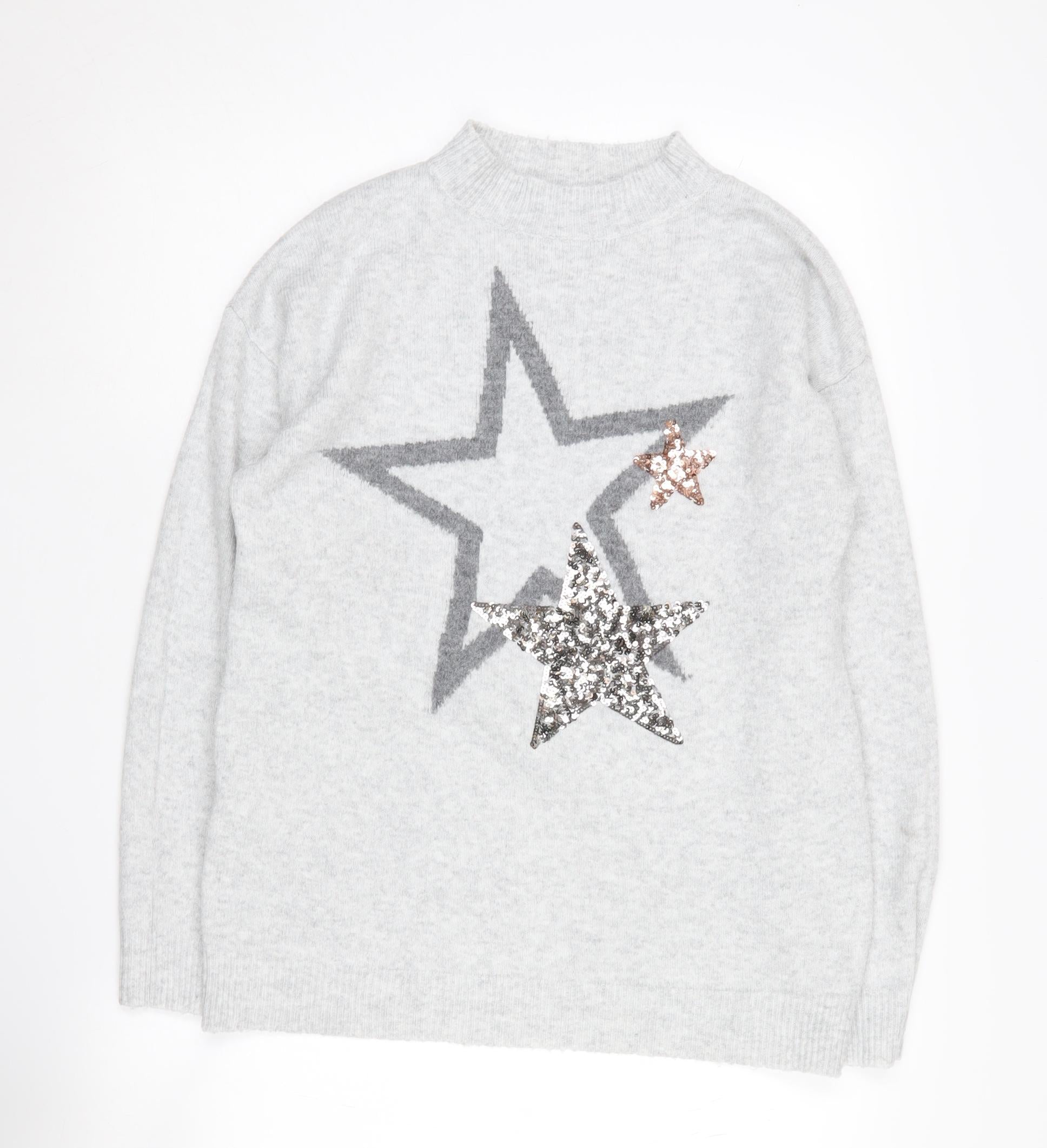 Elevate your casual wardrobe with this stylish Marks and Spencer women's pullover jumper, perfect for the autumn and winter seasons. Crafted in a soft knit fabric, this grey jumper features elegant sequin star accents that add a touch of sparkle to your look. The high neckline and long sleeves make it a cozy option for cooler days, while the lightweight material ensures comfortable wear. Designed for regular fit, this jumper is ideal for any casual occasion. Pair it with jeans or a skirt for a chic, effortless style. The mix of polyester, acrylic, polyamide, and elastane in the garment promises durability and a slight stretch for the perfect fit. Easy to care for, it's machine washable. Make a statement with this star-themed jumper that combines comfort and style seamlessly.